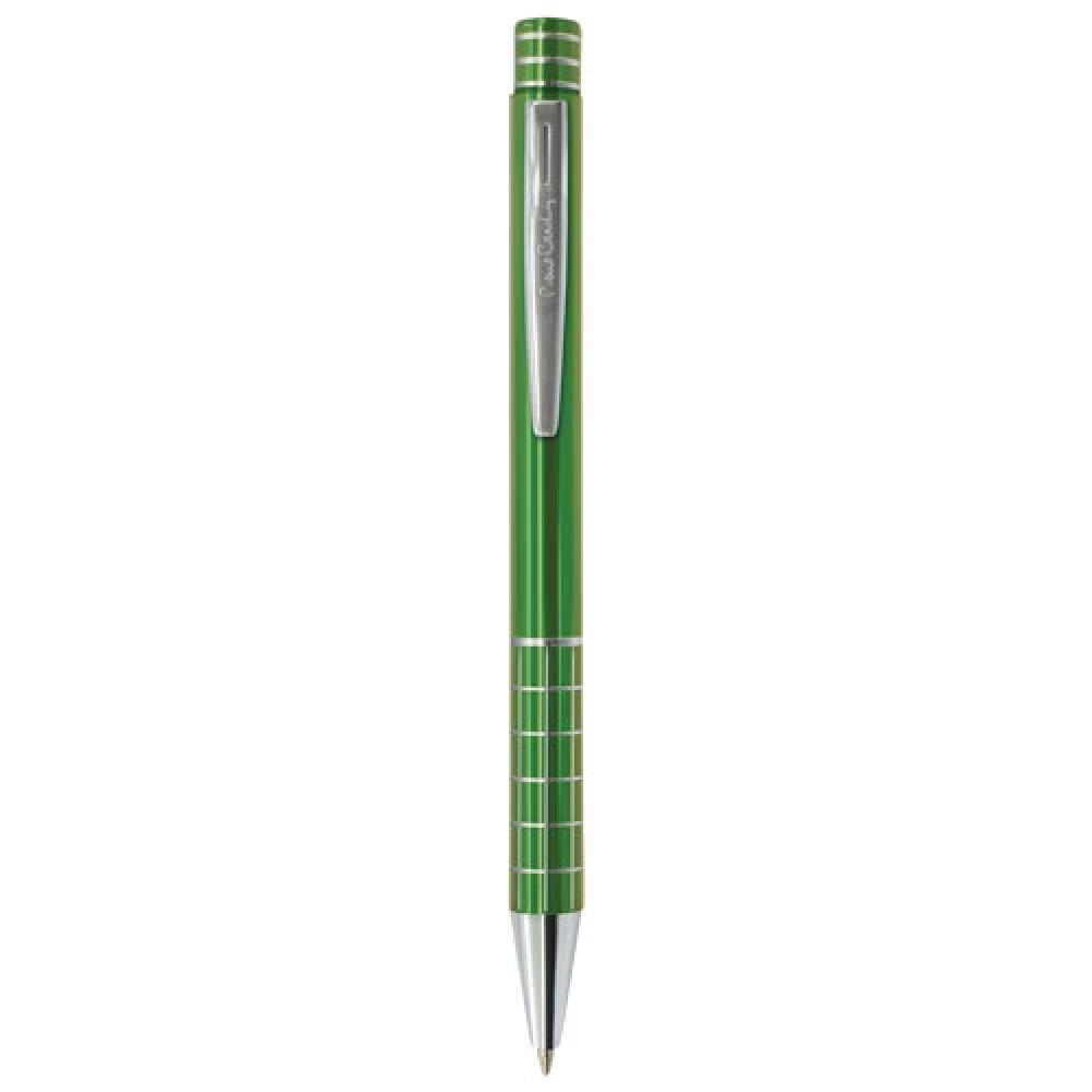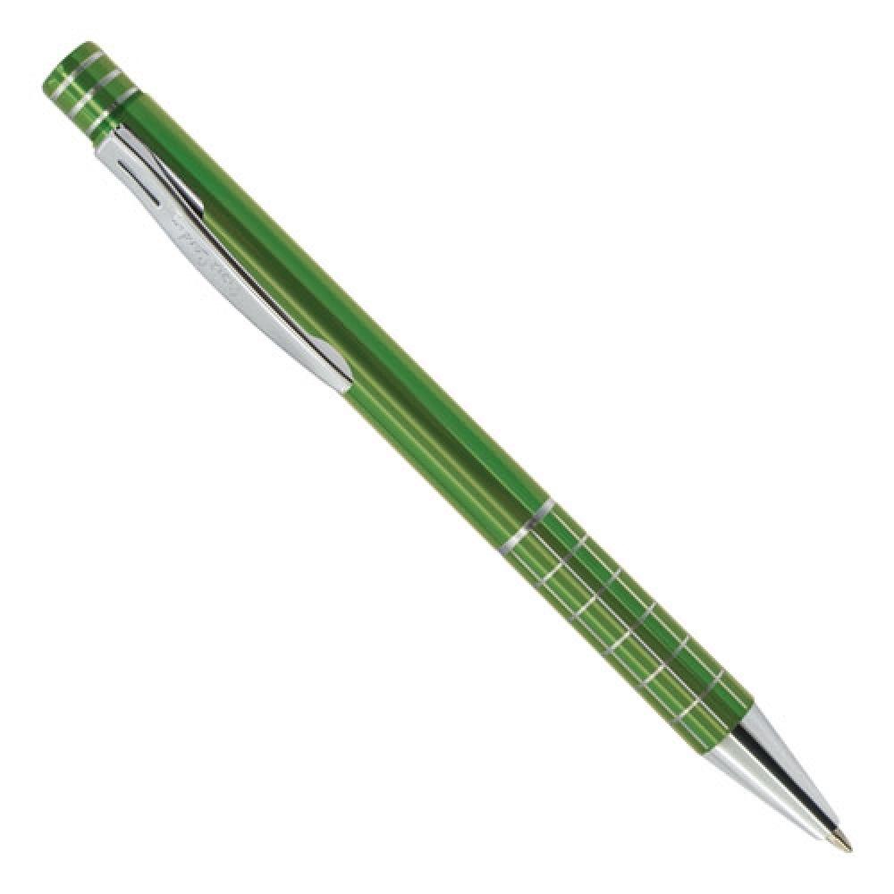 Металлическая ручка с синей пастой. Корпус электрического цвета с металлическими линиями. В комплекте замшевая обложка.