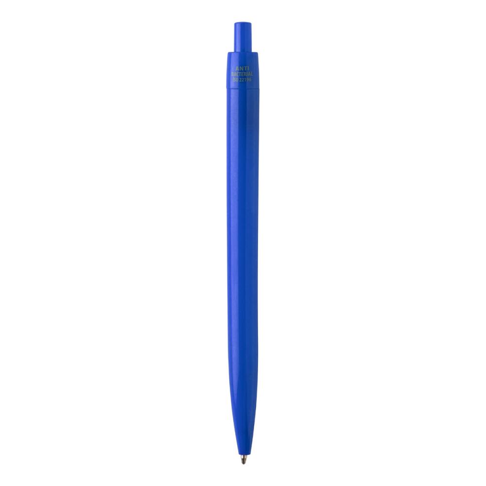 Пластиковая шариковая ручка с антибактериальным корпусом. Содержит наносеребро, которое предотвращает размножение бактерий на корпусе ручки. С механизмом нажатия и синим стержнем. Соответствует стандарту ISO 22196:2011.