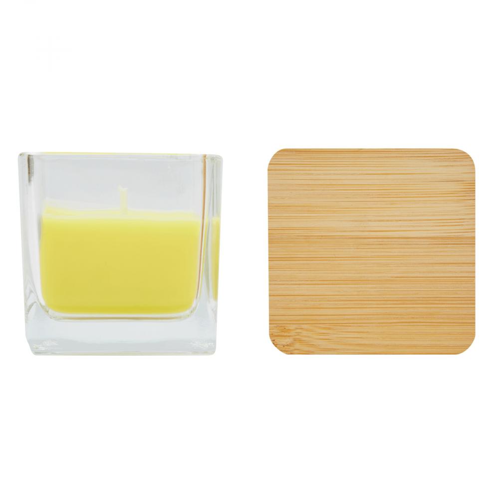 Ароматическая свеча GLOW: в квадратном стекле, цветной воск с ароматом лаванды, бамбуковая крышка с силиконовым уплотнительным кольцом, время горения около 8 часов