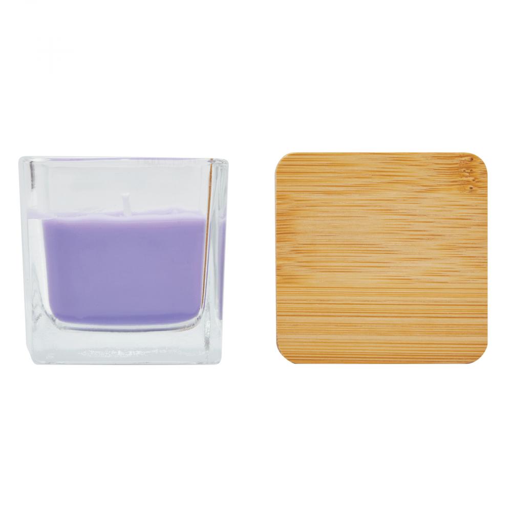 Ароматическая свеча GLOW: в квадратном стекле, цветной воск с ароматом лаванды, бамбуковая крышка с силиконовым уплотнительным кольцом, время горения около 8 часов