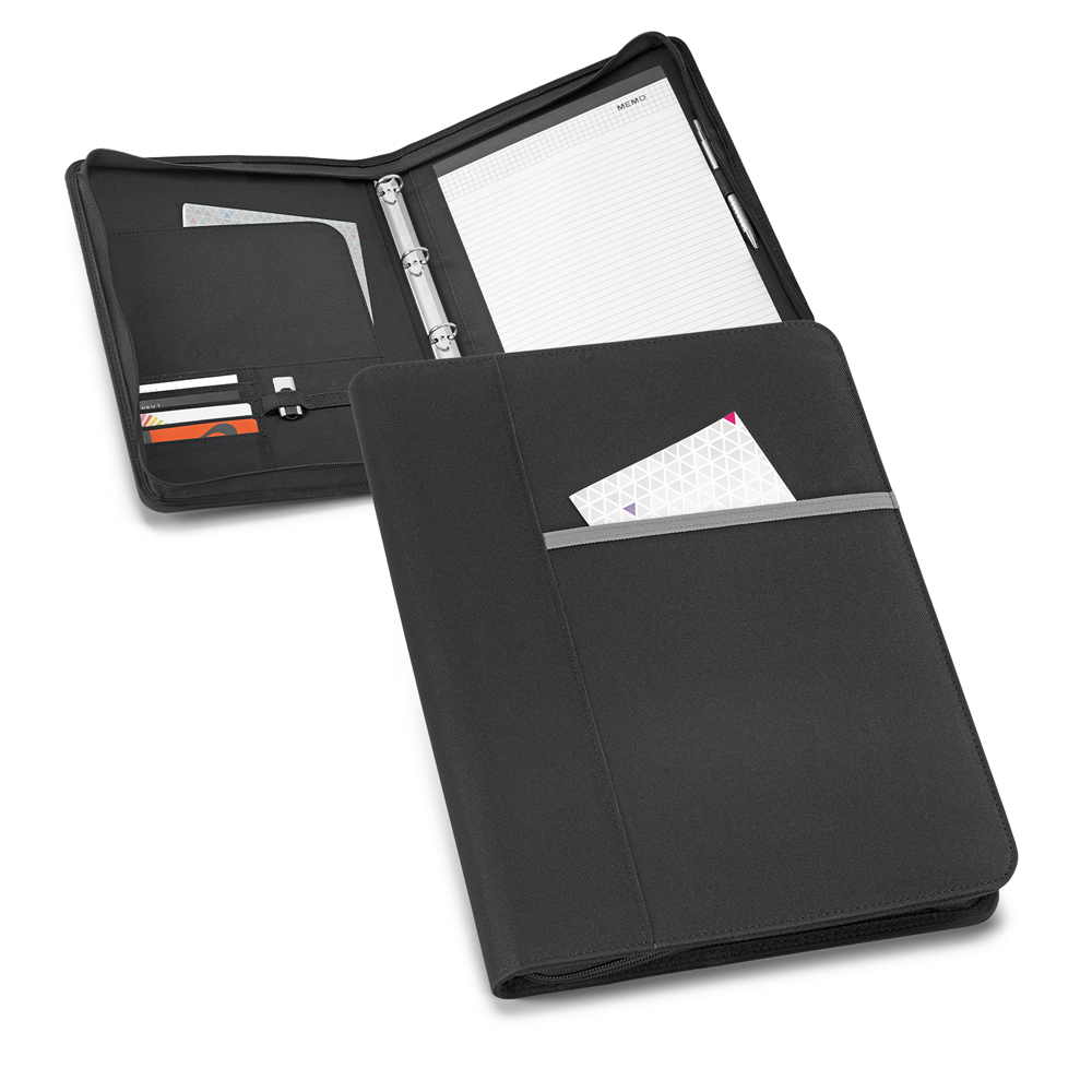 Папка формата A4 из материала плотностью 600D, с внешним передним карманом, 4 кольцами (20мм) внутри для листов формата A4. Данная папка поставляется с блокнотом с 20 листами в линейку. 260 x 340 x 35 мм