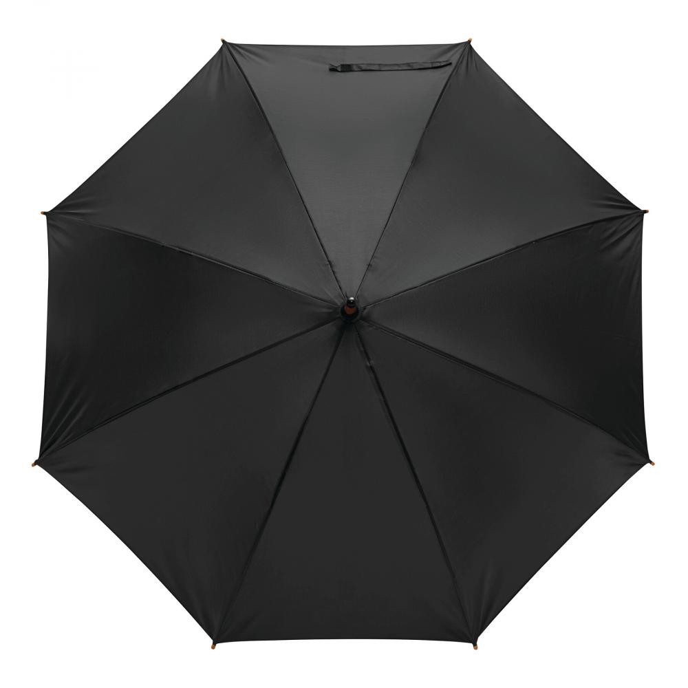 Автоматический зонт-трость JAZZ: с фиберглассовыми спицами, деревянными наконечниками и деревянной изогнутой ручкой, купол из полиэстера, изготовленного из переработанного пластика (RPET), ремешок для закрытия на липучке.