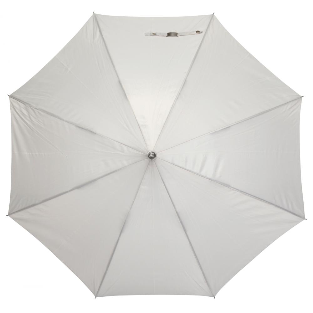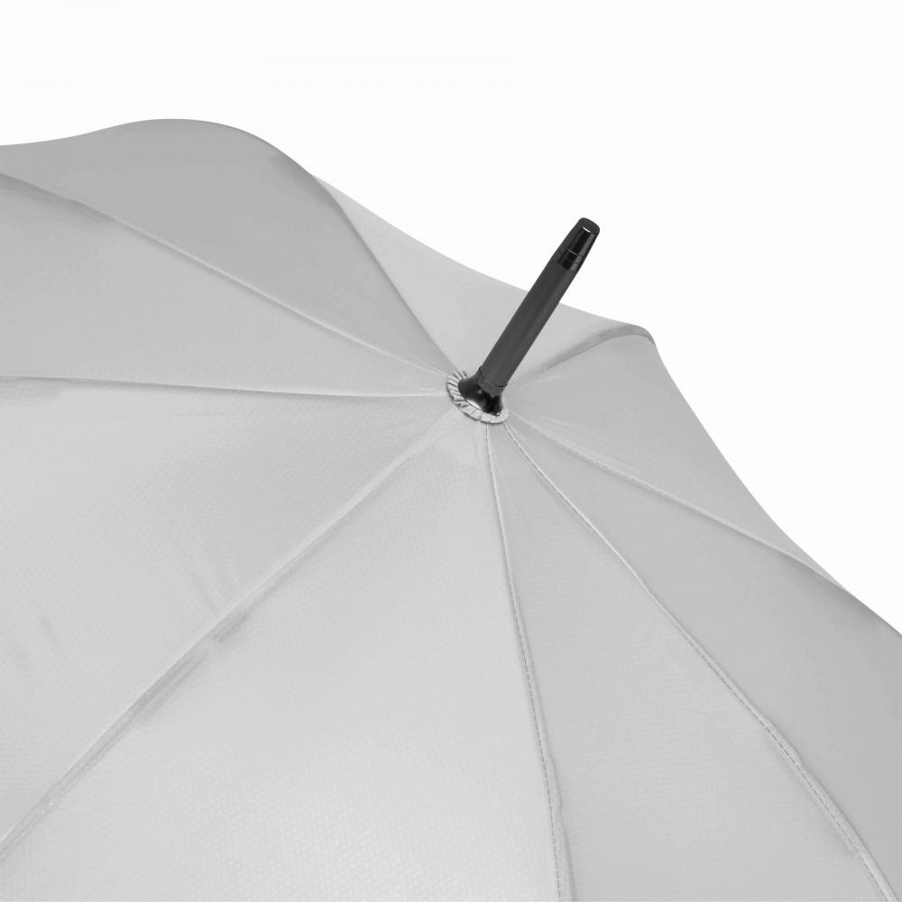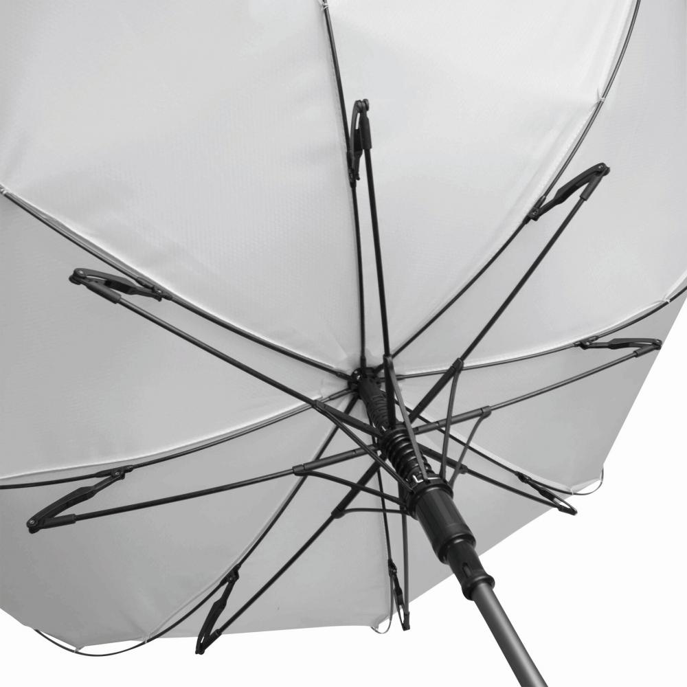 Автоматический ветрозащитный зонт JUBILEE: алюминиевый стержень, ребра из стекловолокна, металлические наконечники, изогнутая ручка с резиновым покрытием соответствующего цвета, навес и чехол из полиэстера с сотовой структурой, с застежкой-кнопкой и металлическая пластина для рекламы