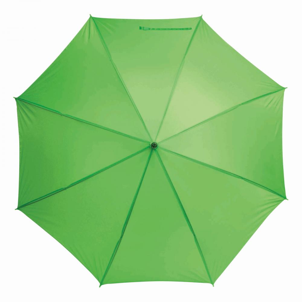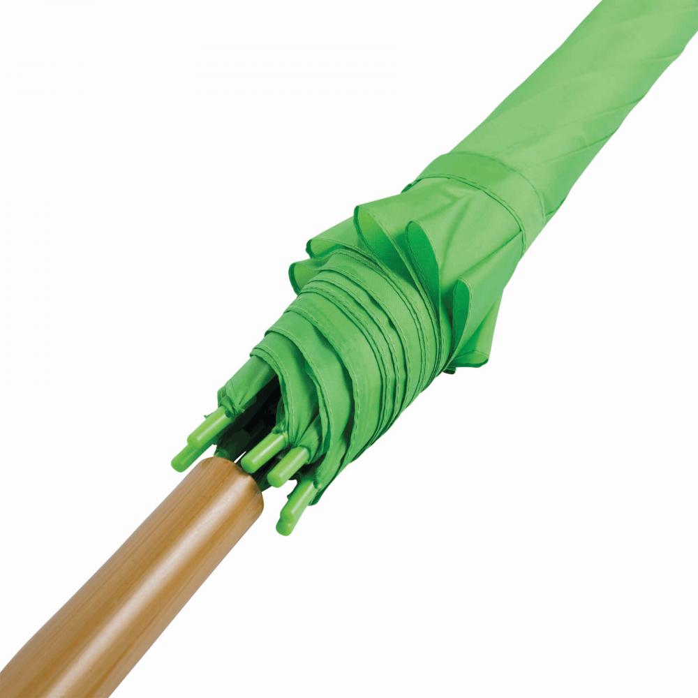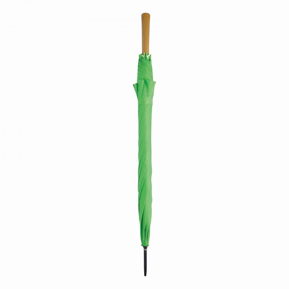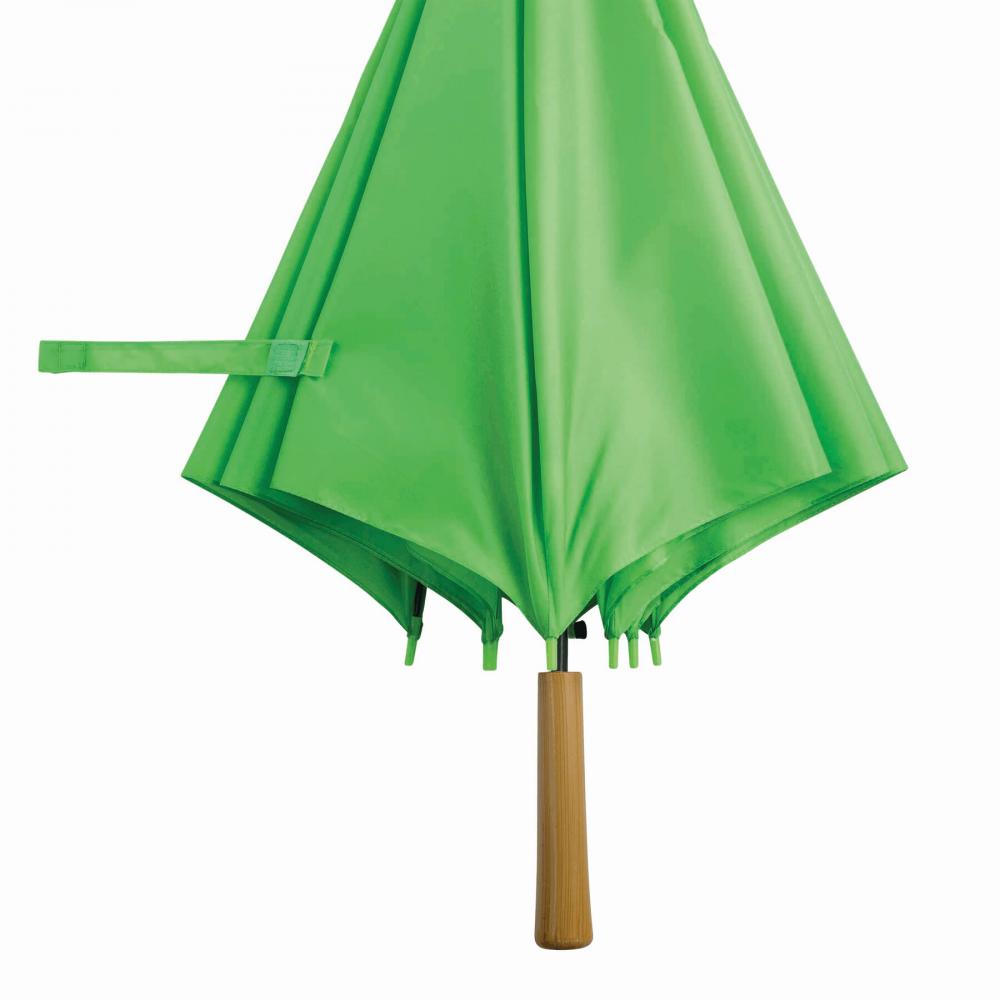 Зонт с автоматической ручкой LIMBO: металлический стержень и ребра, пластиковые наконечники того же цвета, деревянная ручка, капюшон из полиэстера, застежка на липучке