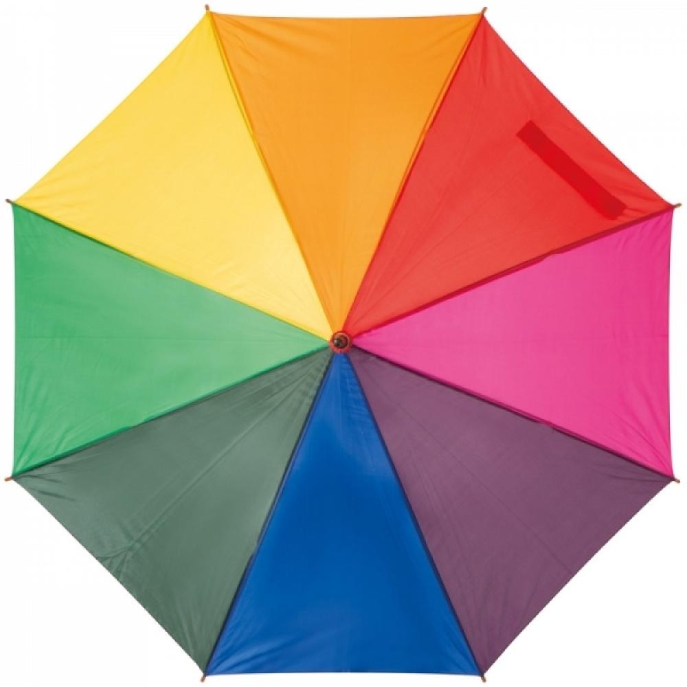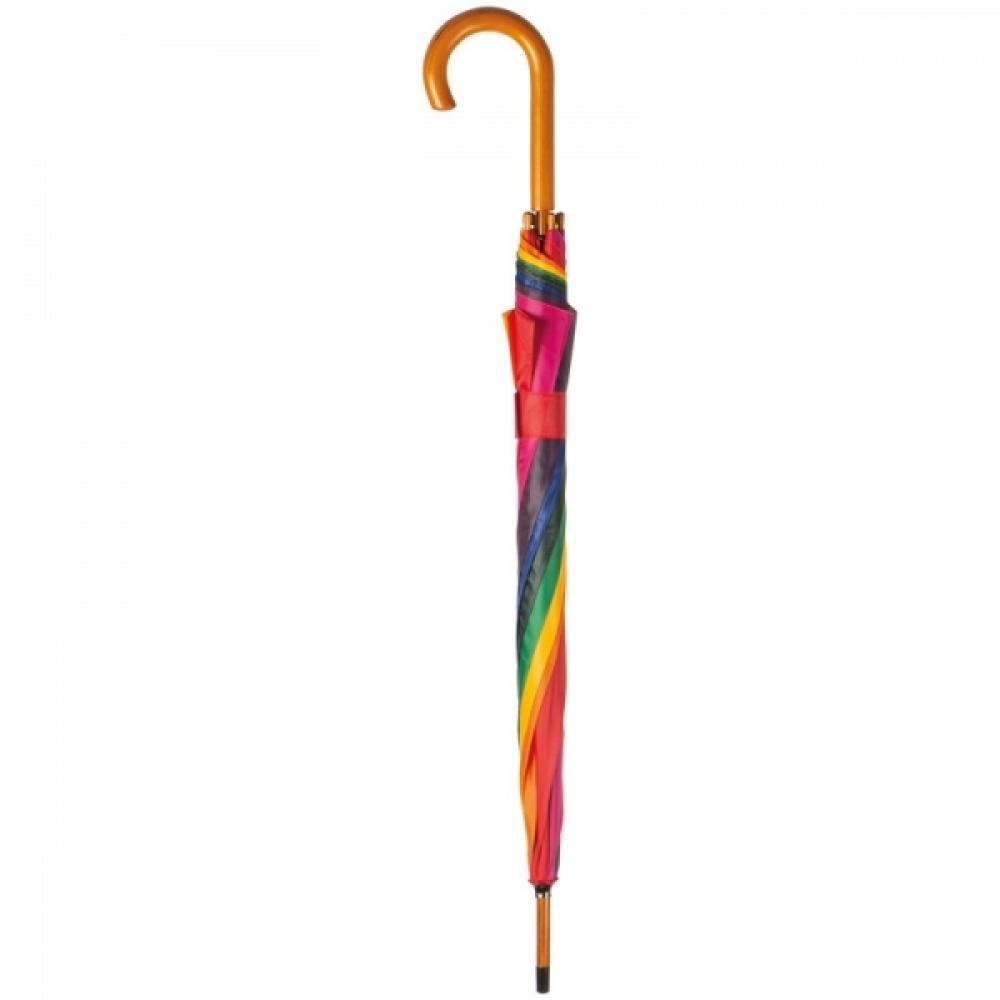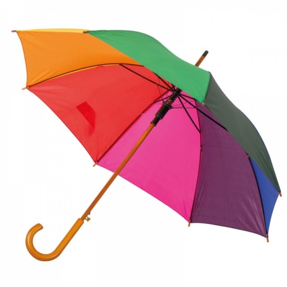 Красочный автоматический зонт с деревянной ручкой. Логотип можно нанести на панели.