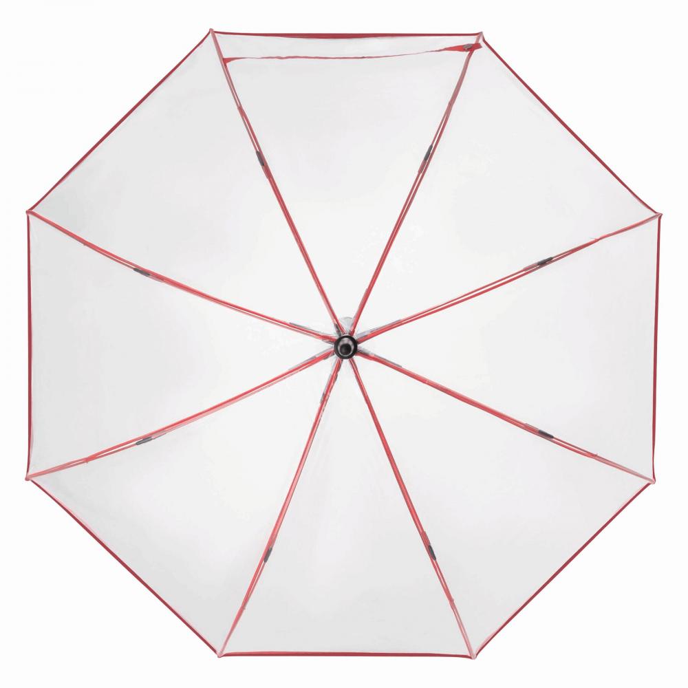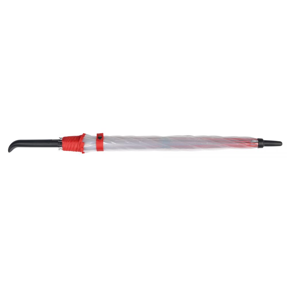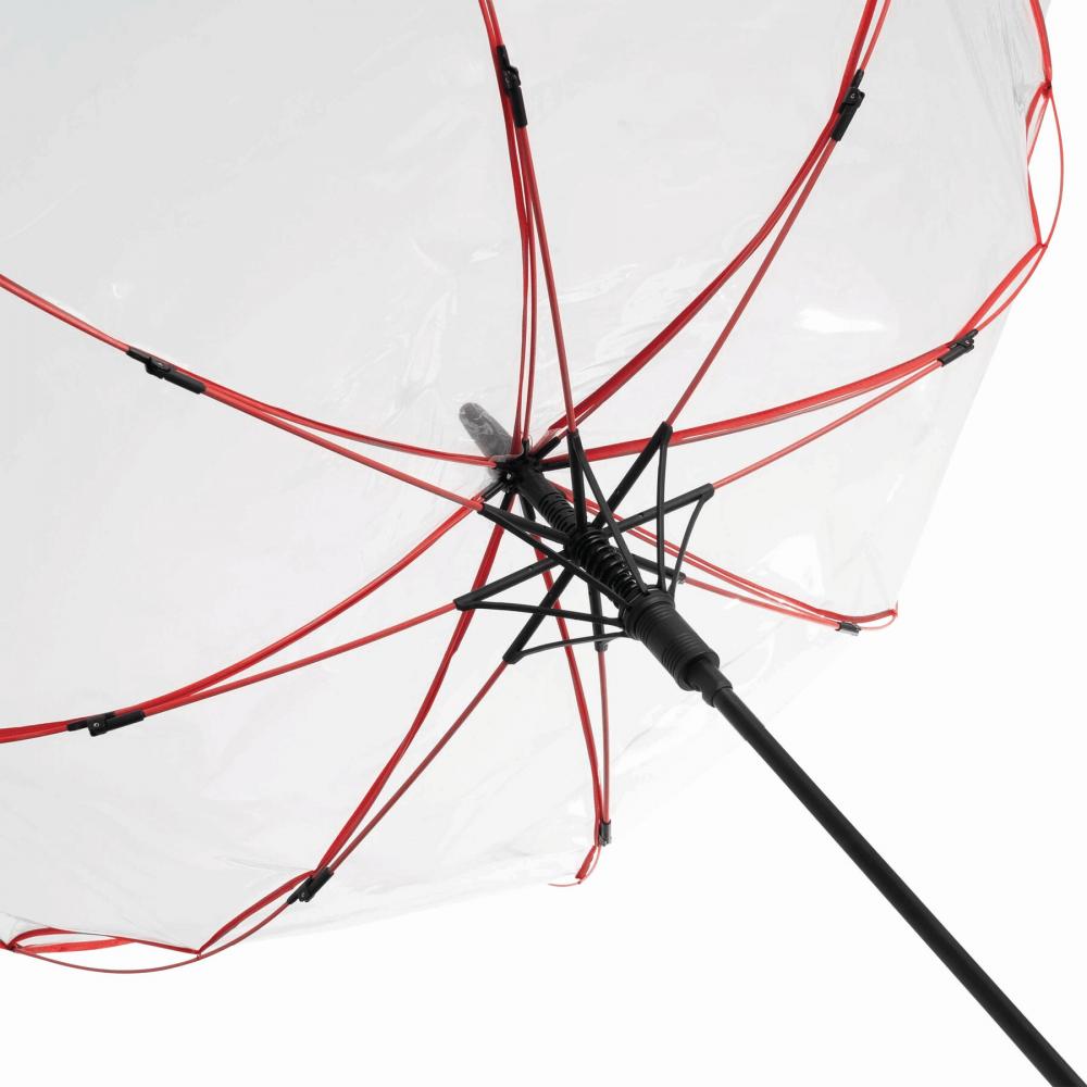Автоматический зонт VIP: металлический стержень, цветные ребра из стекловолокна с металлическими наконечниками, пластиковый верх, пластиковая ручка со встроенной кнопкой нажатия, прозрачный навес из POE с цветным переплетом, закрытие с помощью кнопки