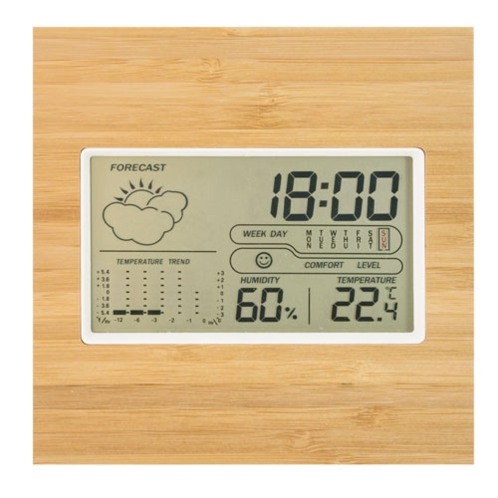 Изготовлен из натурального бамбука, идеально подходит для офисов, компьютерных комнат, домов, теплиц и т.д. Максимальная/Минимальная температура Максимальная/Минимальная влажность Температурная сигнализация Время Календарь Индикатор уровня комфорта С подставкой для стола и возможностью крепления на стену Работает от 2 батареек AAA (в комплект не входят)