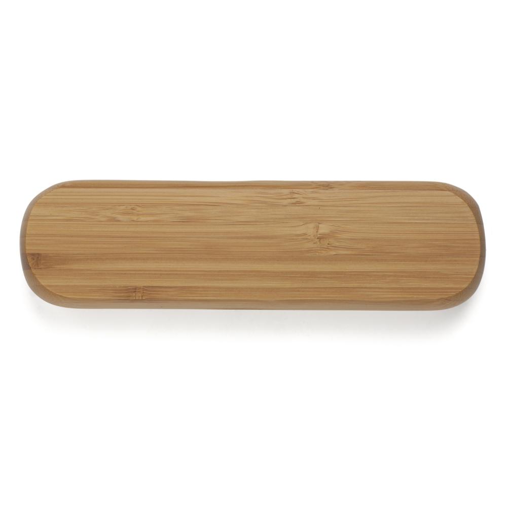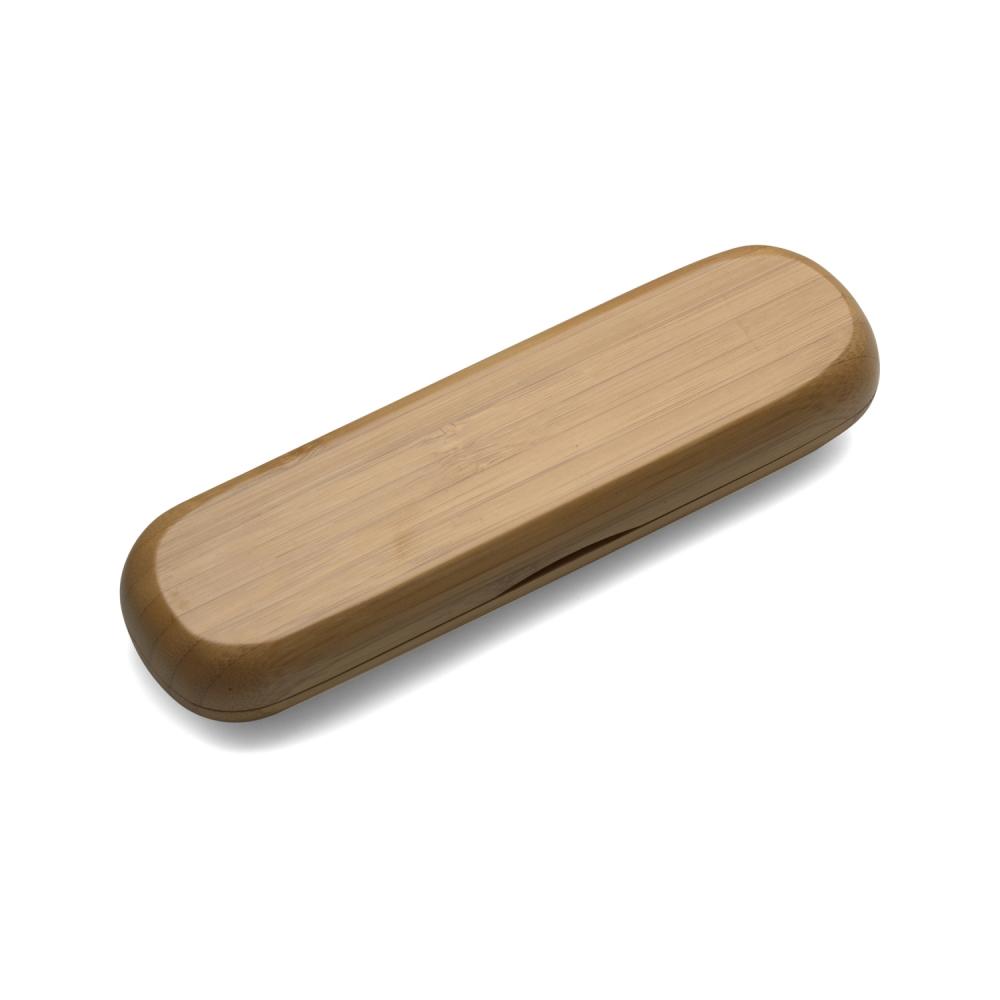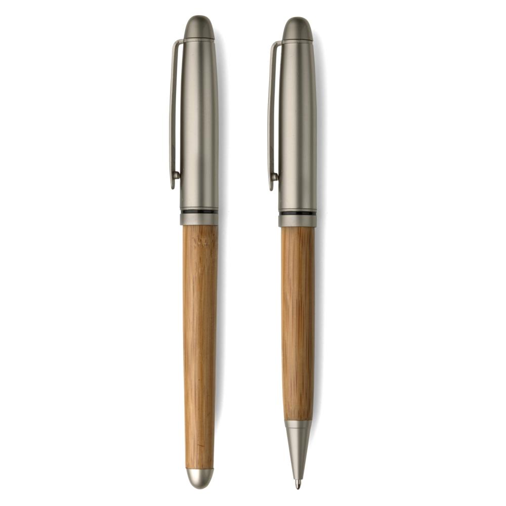 Набор для письма из бамбука в футляре: шариковая ручка и роллерная ручка, обе с металлическими элементами.