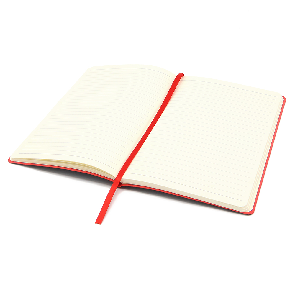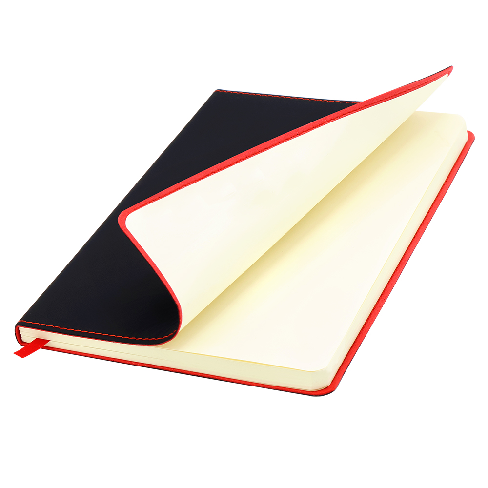 Блонот формата А5 в мягкой обложке из искусственной кожи. Материал обложки - термополиуретан. Основной цвет - чёрный; строчка по периметру, внутенний край и ляссе - красного цвета. Размеры: 214*144мм, 80 листов, разлинееные страницы, бумага плотностью 80г/м2.
