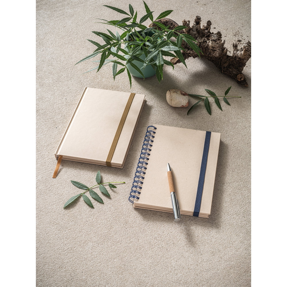 Блокнот формата А5 в твердом переплете из бумаги сахарного тростника (80% сахарного тростника). Внутренняя часть содержит 160 линованных страниц из бумаги сахарного тростника (80% сахарного тростника) (90 г/м2), ленту и резинку для закрытия блокнота. 147 x 216 мм