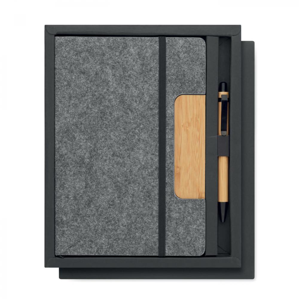 Блокнот А5 в твердой обложке RPET с подставкой для телефона и бамбуковой шариковой ручкой. В переплете. 160 линованных страниц из переработанной бумаги (80 листов). Эластичный ремешок. Закладка-лента. Синие чернила.