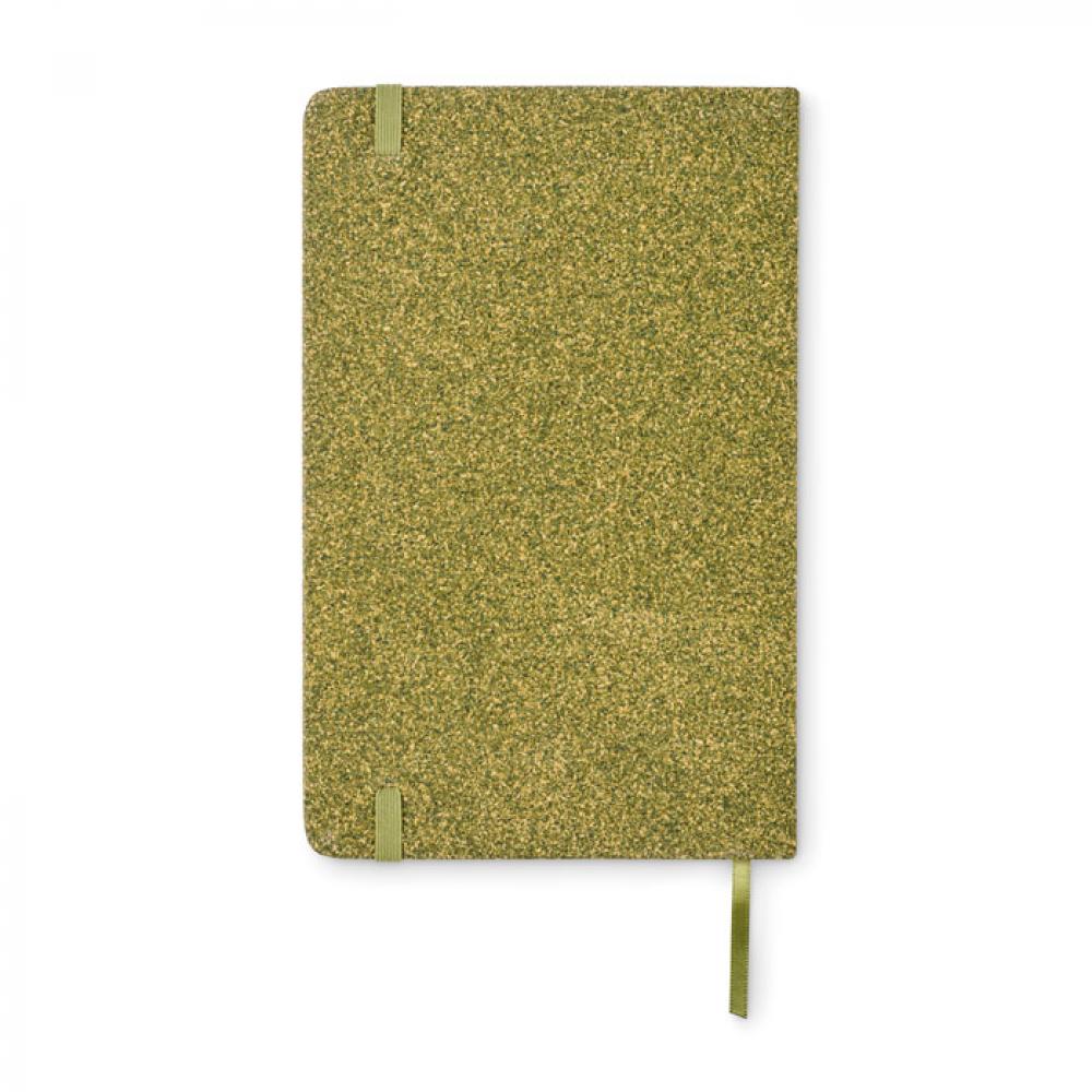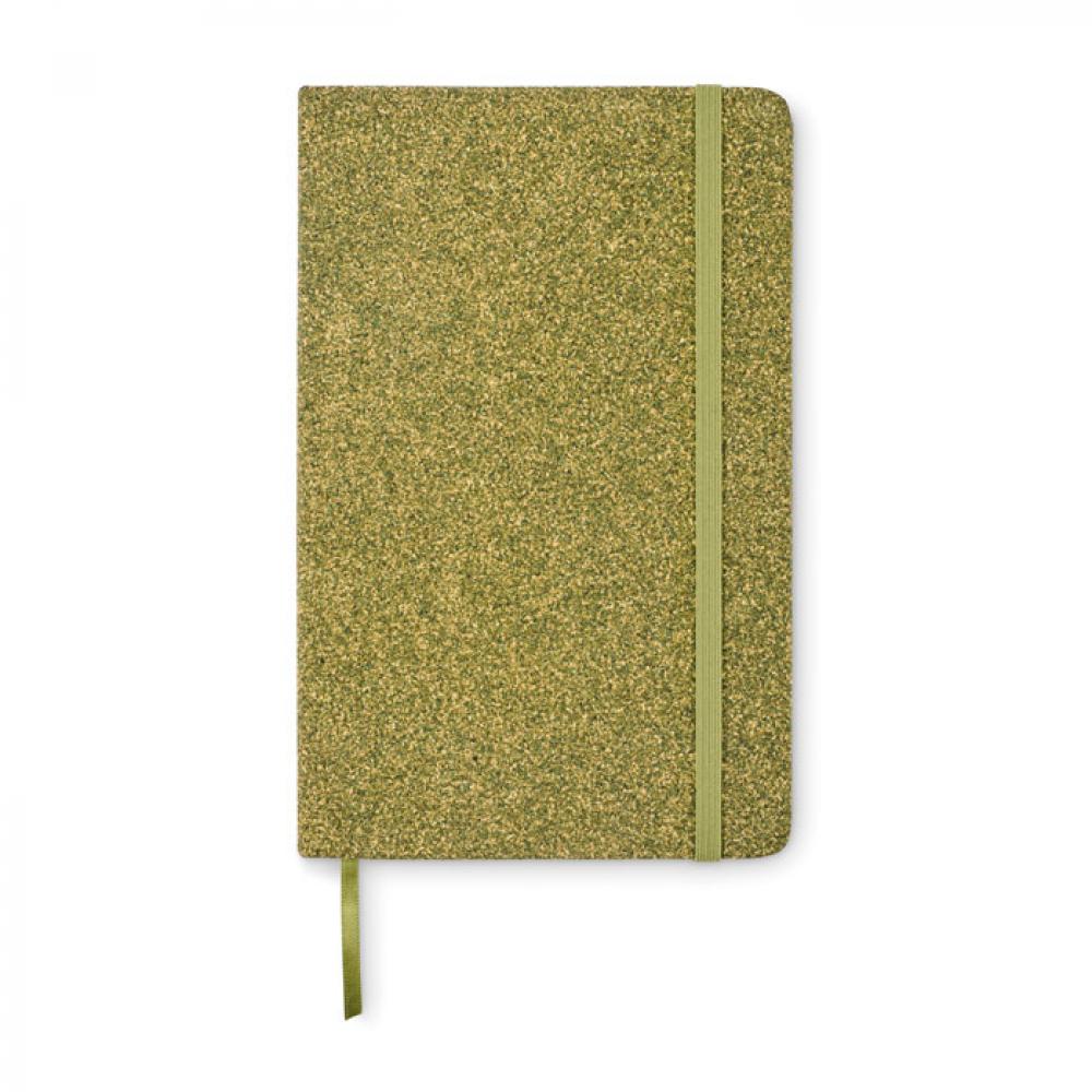 Блокнот А5 в твердой обложке из 20% чайного порошка, 30% пробки и 50% поликоттона. В футляре. 160 линованных страниц из переработанной бумаги (80 листов/70 г/м²). Резинка в цвет блокнота и лента-закладка.
