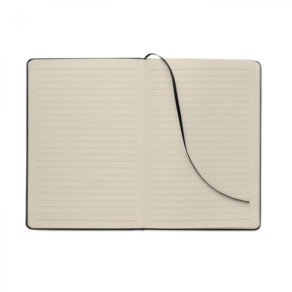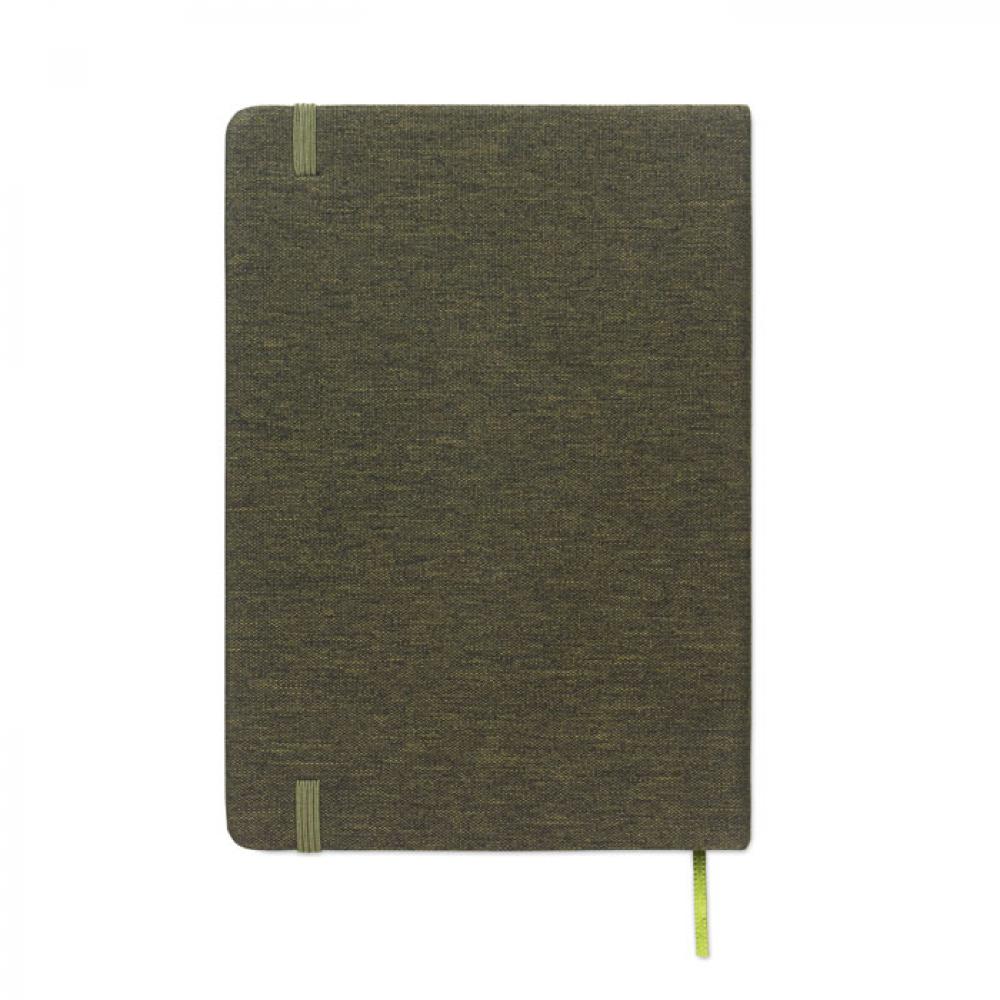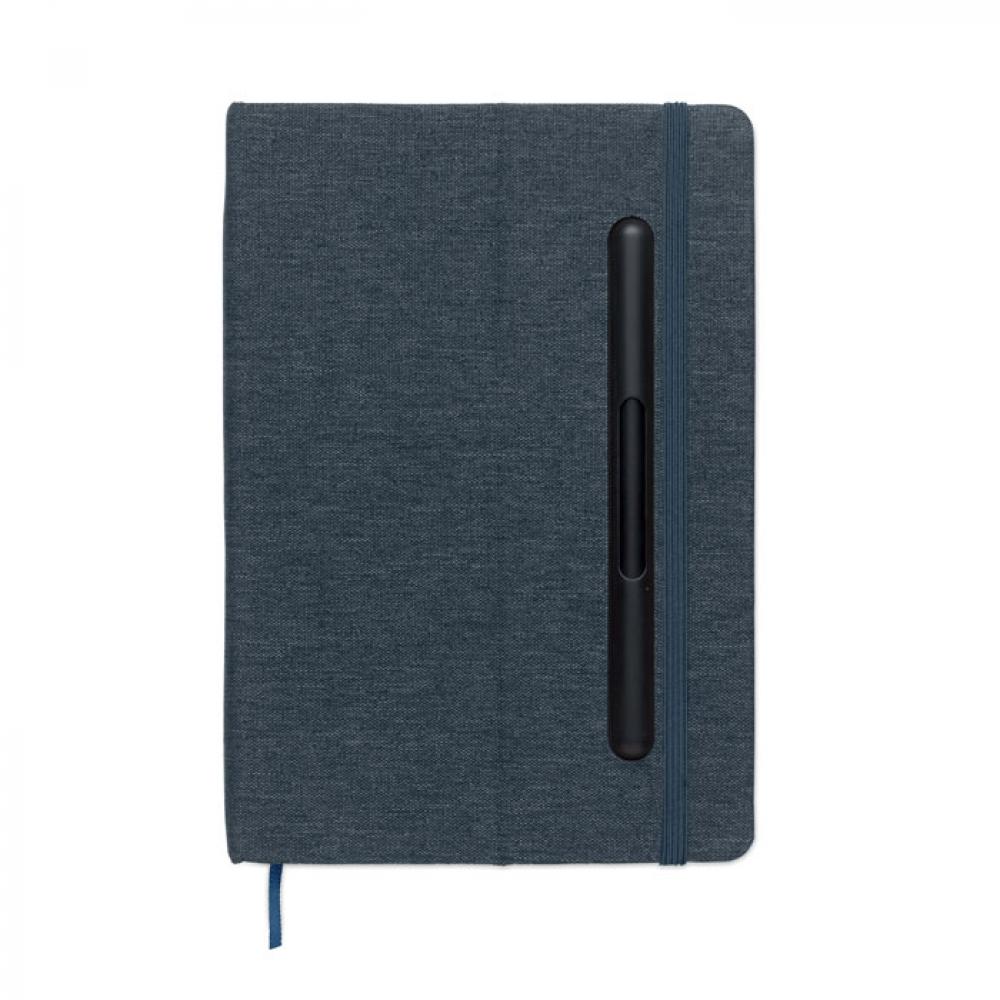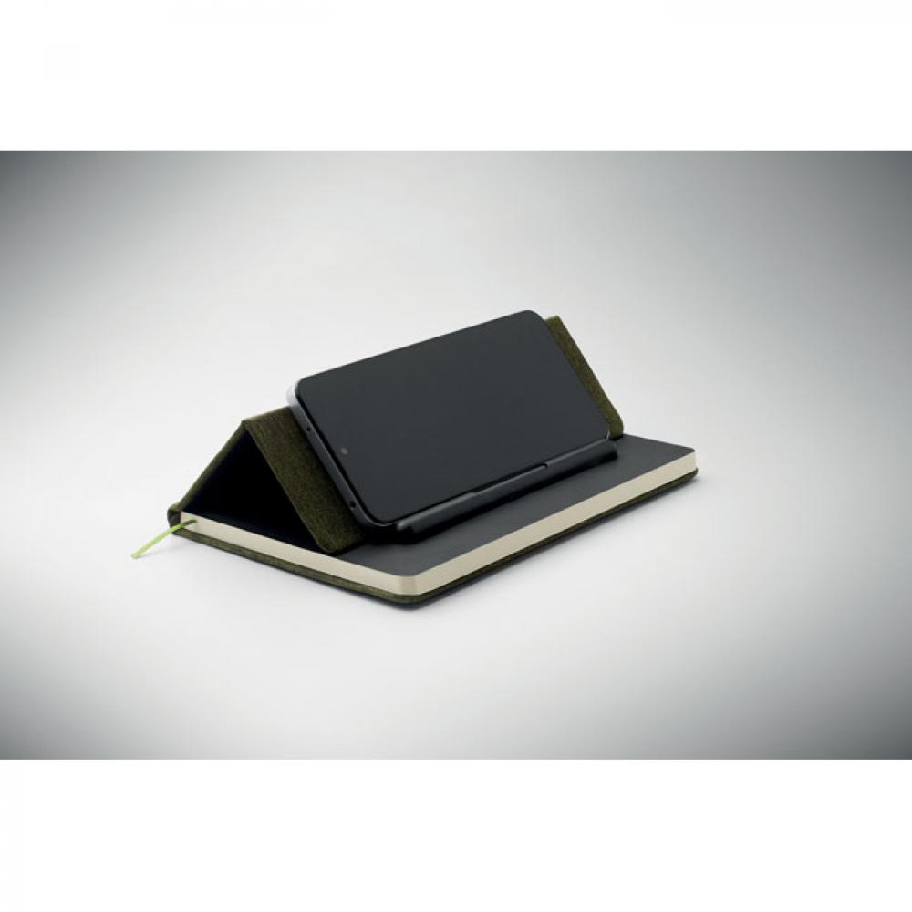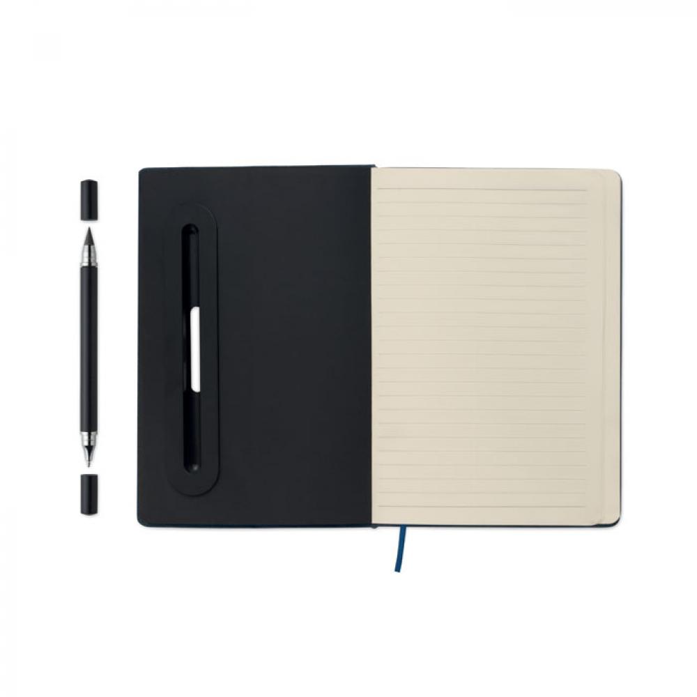 Блокнот формата A5 в твердой обложке из RPET с функцией держателя для телефона. В комплекте ручка 2-в-1: бесчернильная и обычная шариковая ручка из пластика. Переплет. 192 страницы из переработанной бумаги в линейку (96 листов). Резинка и закладка в цвет блонота.