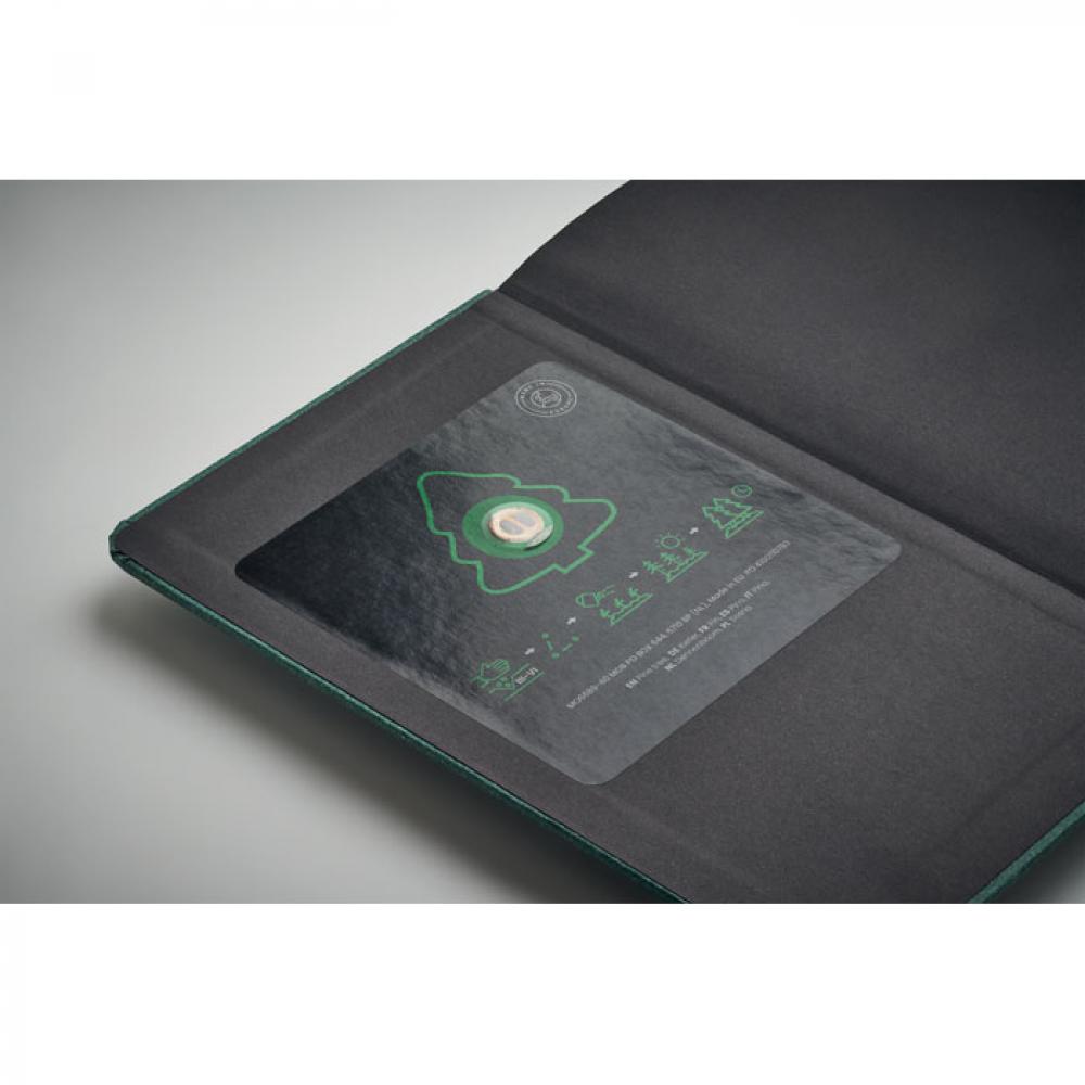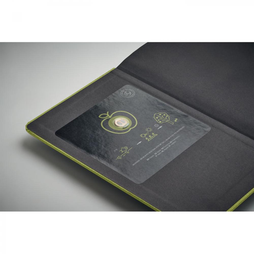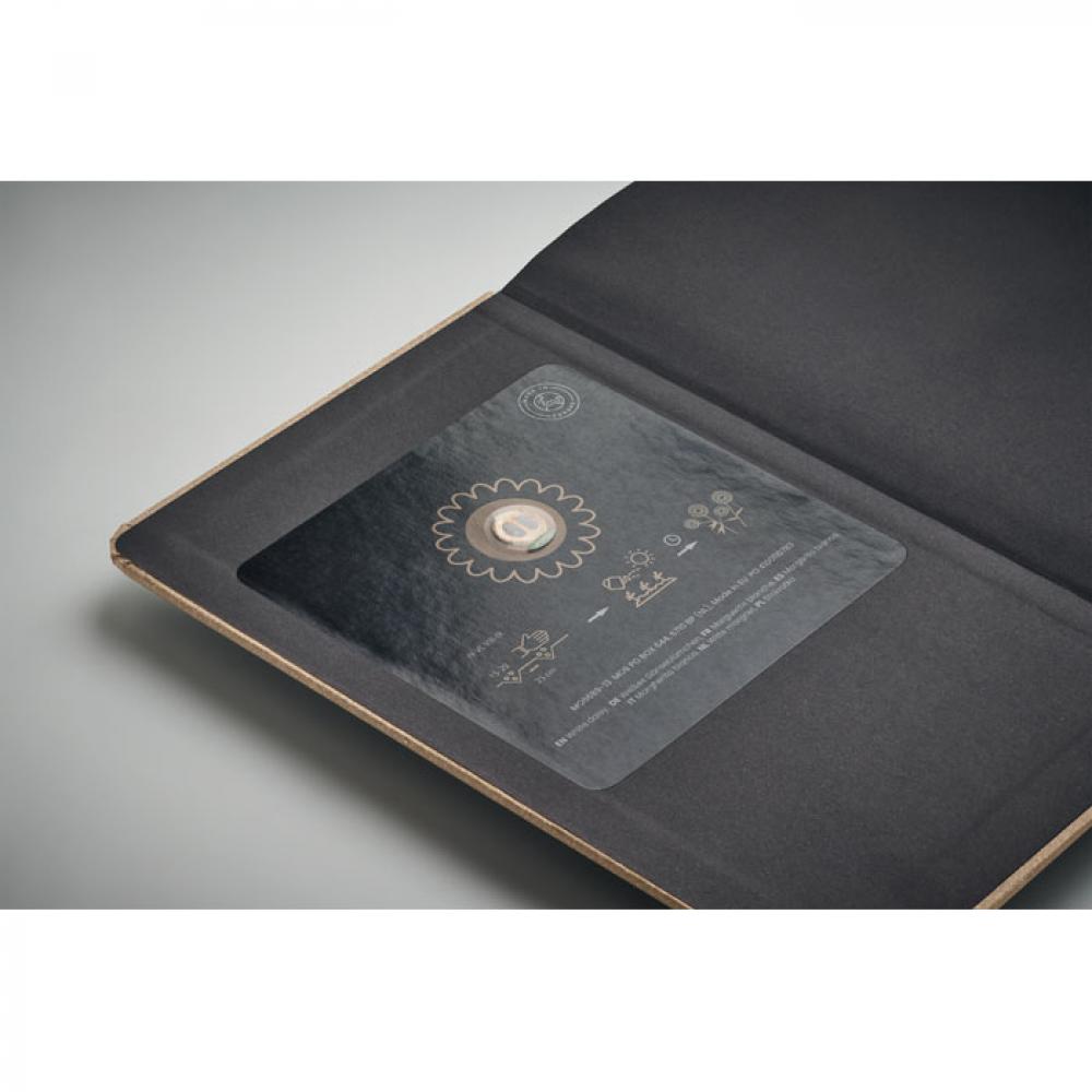 Блокнот формата A5 с обложкой из прочной твердой бумаги. В переплете. 184 линованные страницы (92 листа) из переработанной бумаги. Закладка из хлопка. Включает семена для посева. Сделано в ЕС.