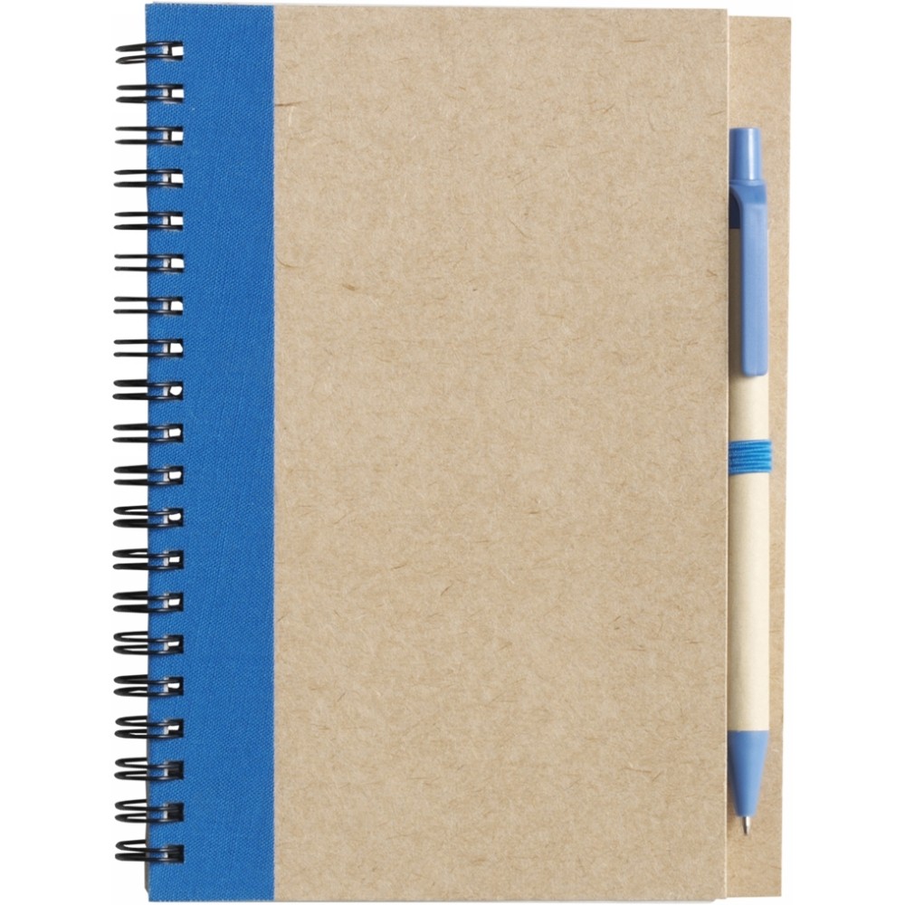 Эко-блокнот (примерно A5, около 60 линованных листов), прикрепленная шариковая ручка с биоразлагаемыми частями, спиральный переплет
