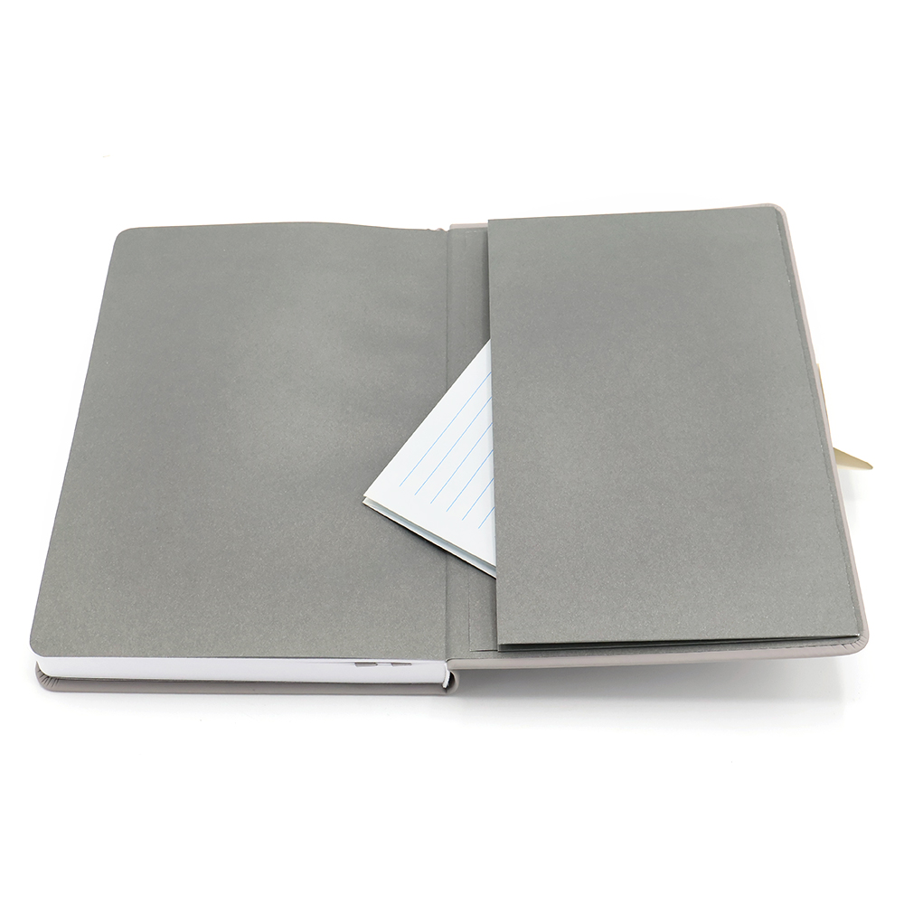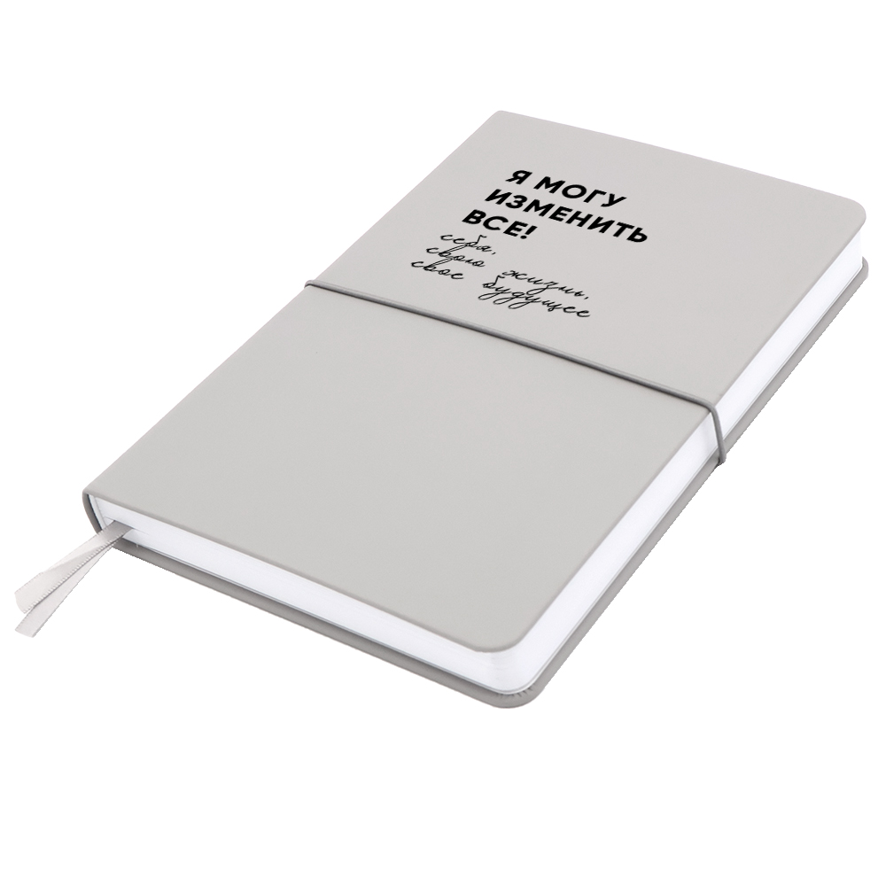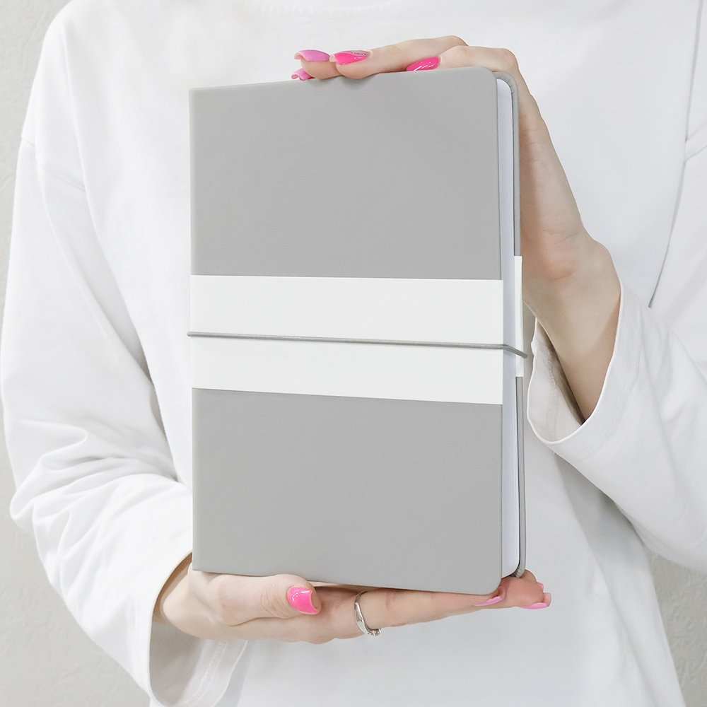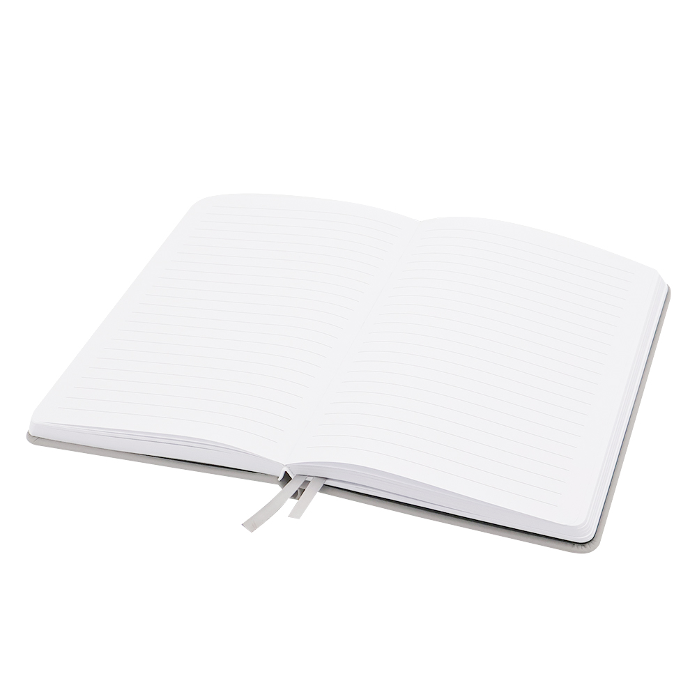 Блокнот А5-формата жёсткой обложке со специальным гладким покрытием. Материал обложки — полиуретан. Карман в нахзаце, форзац, двойное ляссе, эластичная застёжка — всё комплиментарно цвету обложки.