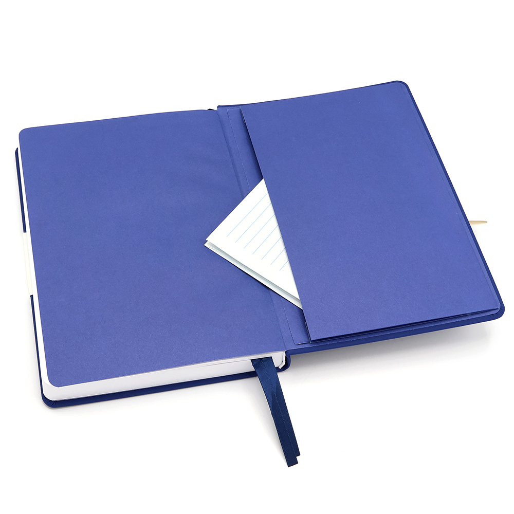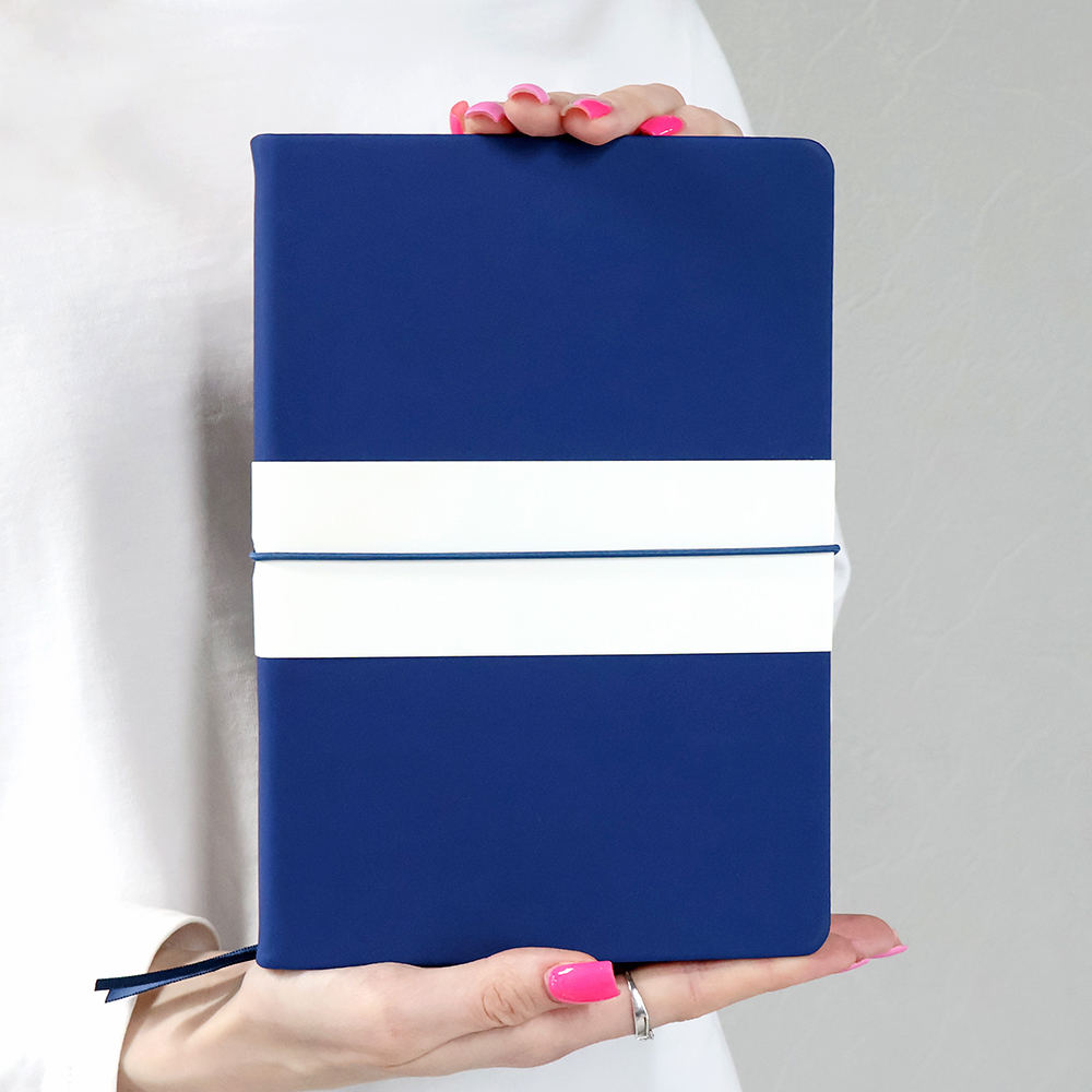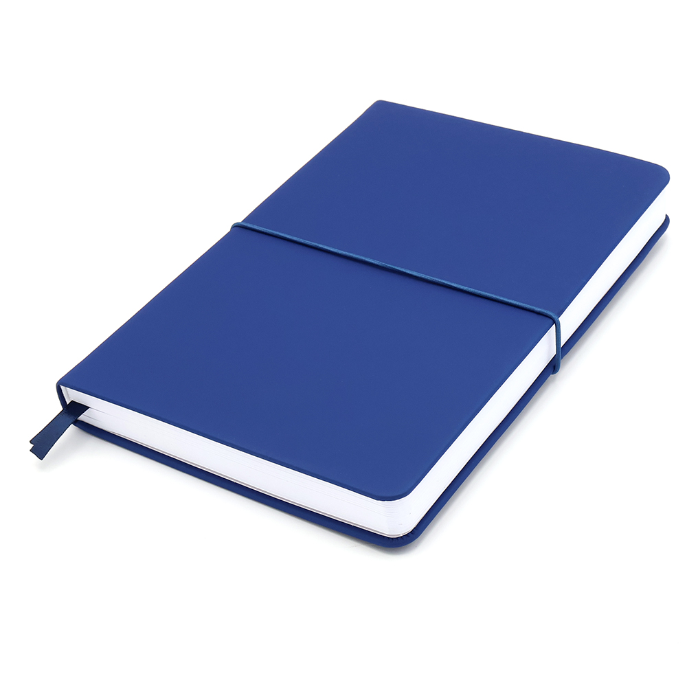 Блокнот А5-формата жёсткой обложке со специальным гладким покрытием. Материал обложки — полиуретан. Карман в нахзаце, форзац, двойное ляссе, эластичная застёжка — всё комплиментарно цвету обложки.