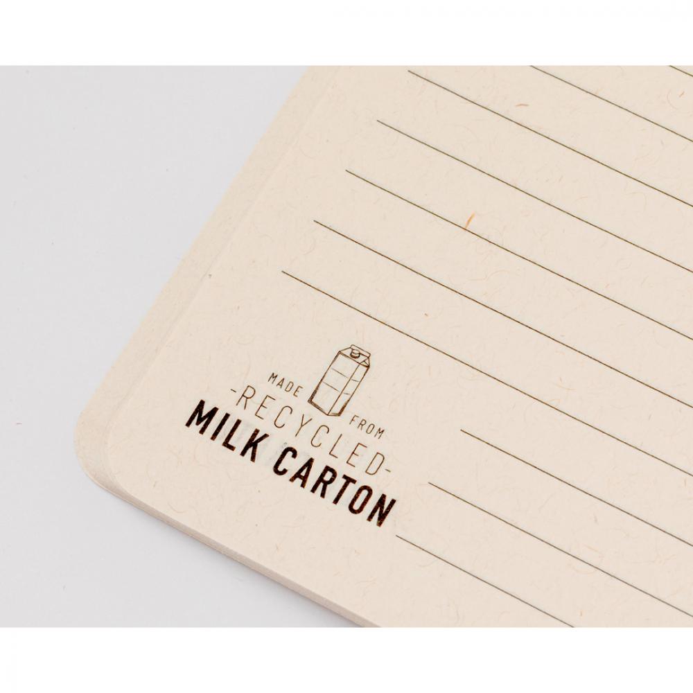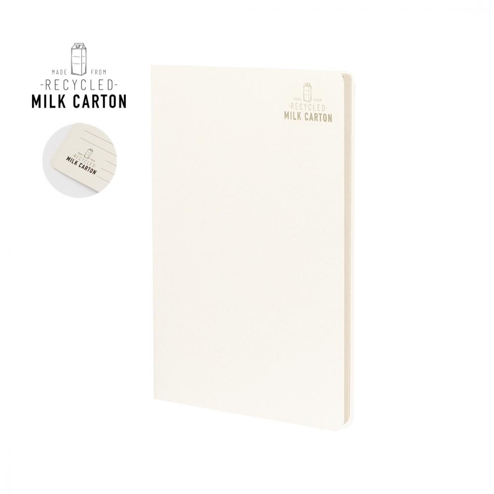 Блокнот из переработанных молочных пакетов. С мягкими обложками, стежком и 60 листами белой бумаги внутри, с одной полосатой. Логотип "Переработанные молочные пакеты" на передней обложке и на внутренних страницах. Поставляется в индивидуальной переработанной сумке. Молочные пакеты в основном изготовлены из картона и алюминия. Во время процесса переработки различные упаковочные материалы разделяются для повторного использования и переиспользования, что способствует бесконечному пути круговой экономики. Этот материал хорошо известен своей высокой способностью к переработке, а также своей легкостью и прочностью. 60 листов Переработанные молочные пакеты