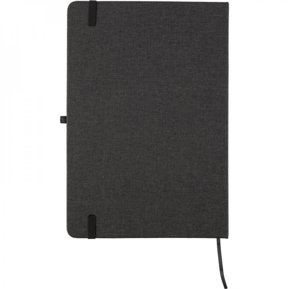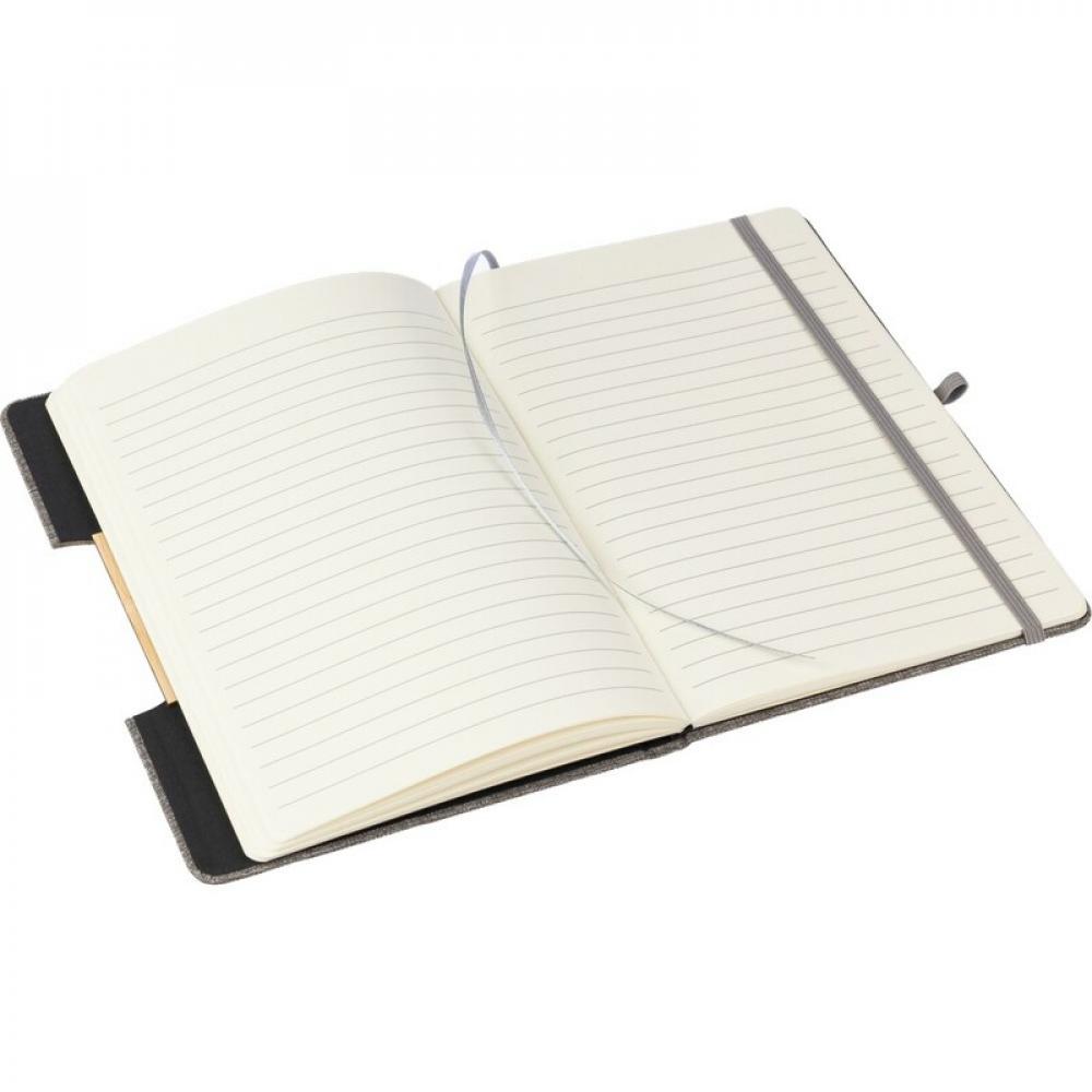Блокнот примерно формата А5 с 80 линейными страницами, лямкой-закладкой для удобного отмечания последней страницы или важных заметок, дополнительной резинкой для закрытия в подходящем цвете, складывающейся обложкой с деталями из бамбука, превращающейся в держатель для телефона, помещается в школьный рюкзак, изделие изготовлено из RPET.