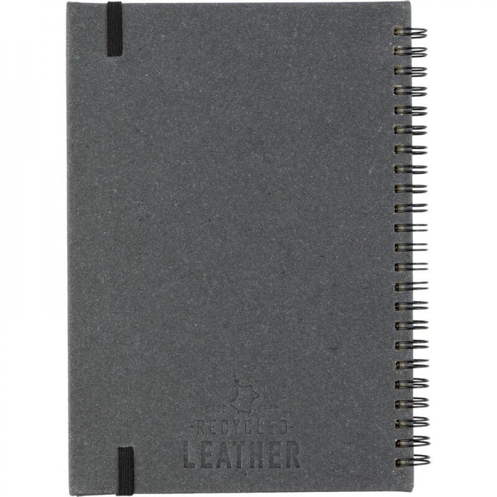 Блокнот примерно формата А5 с 80 линейными страницами, мягкая обложка, лямка-закладка для удобного отмечания последней страницы или важных заметок, помещается в школьный рюкзак, изделие из переработанной кожи.