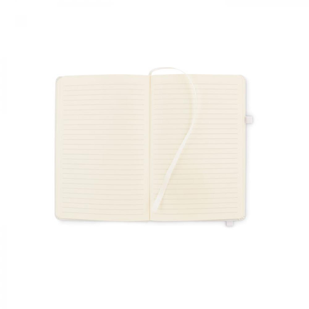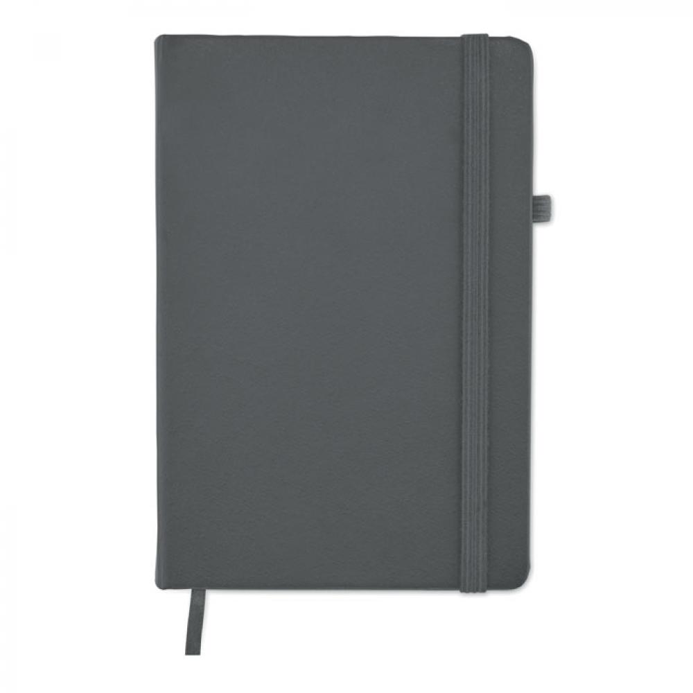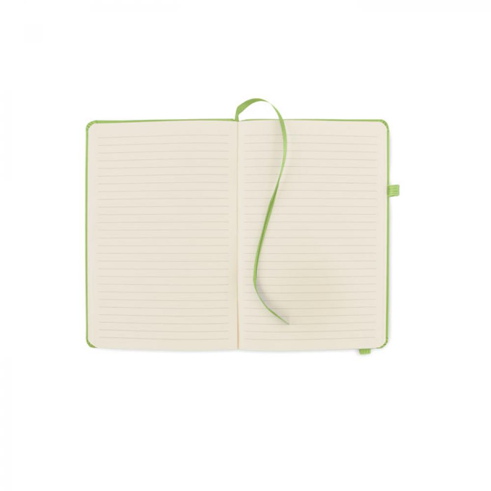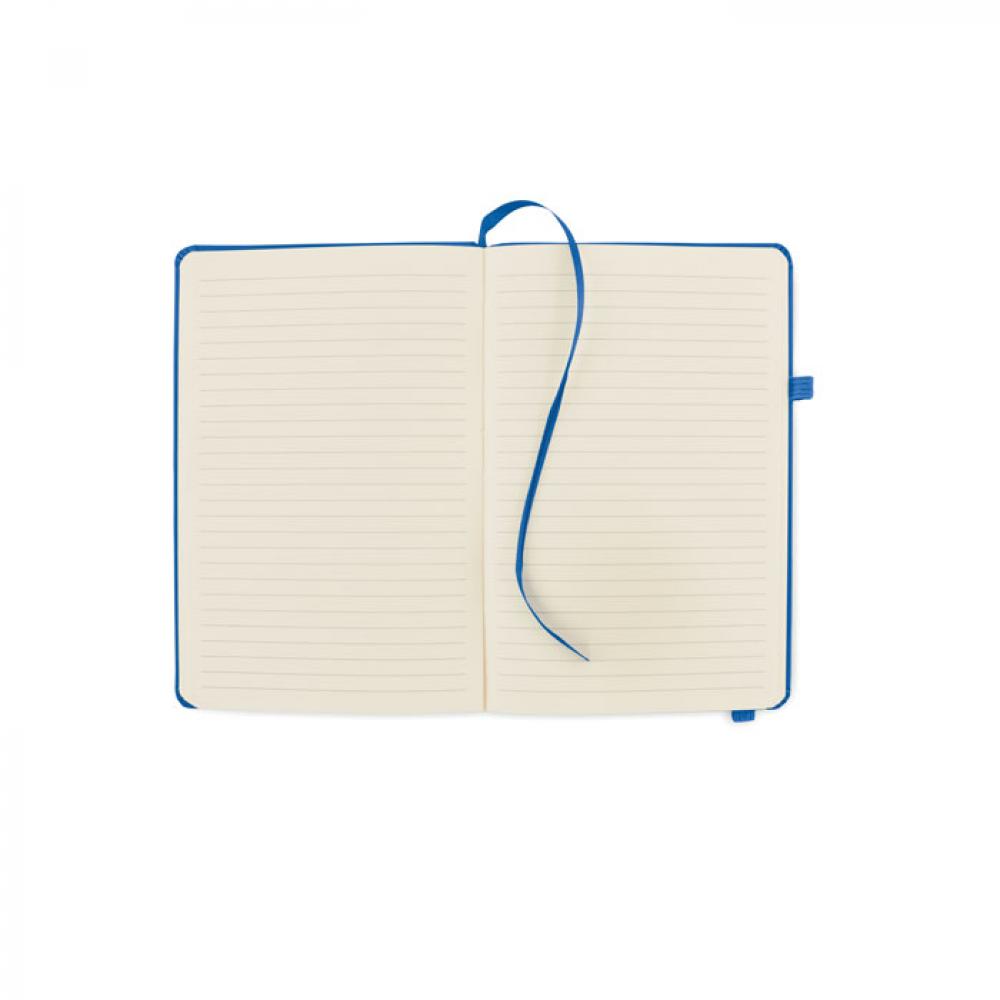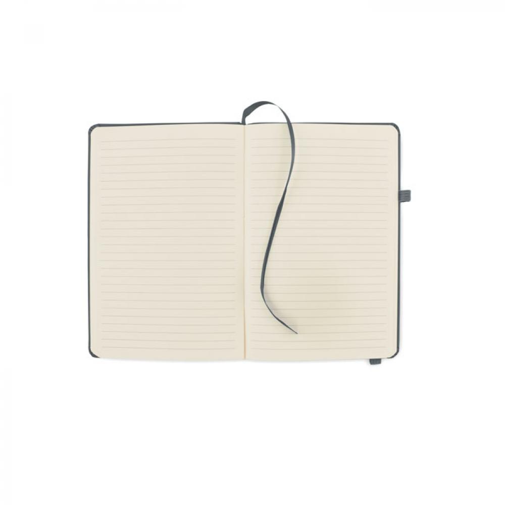 Блокнот формата A5 с обложкой из переработанного полиуретана. Переплет. 192 линованные страницы из переработанной бумаги (96 листов). Эластичный ремешок и крепление для маркеров и ручек.