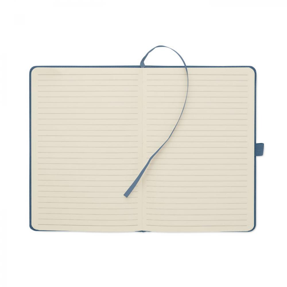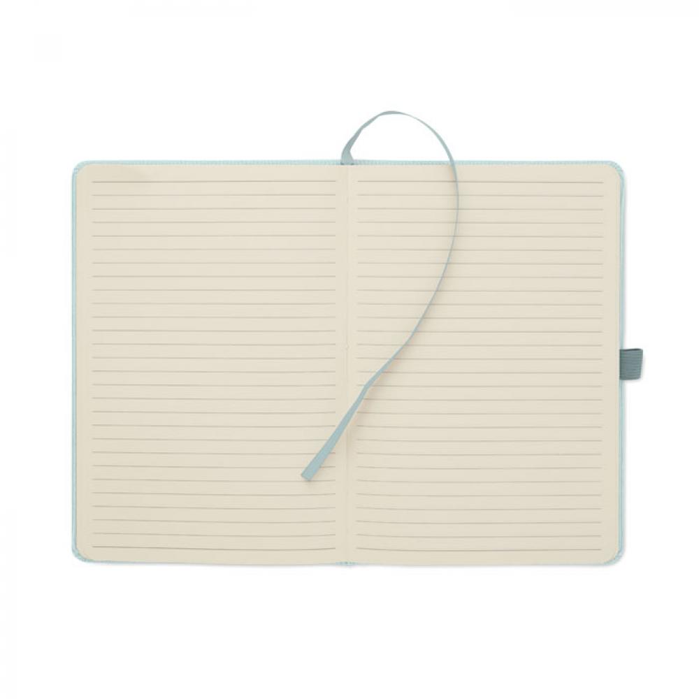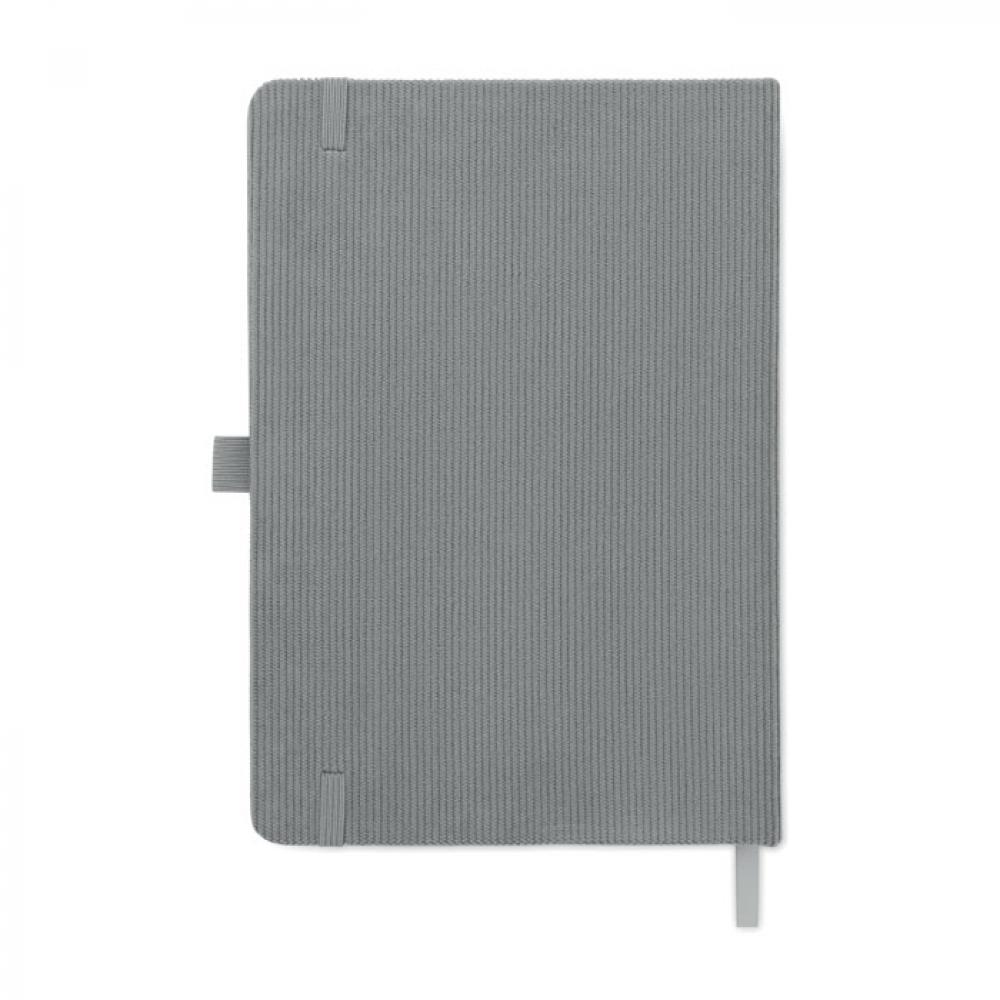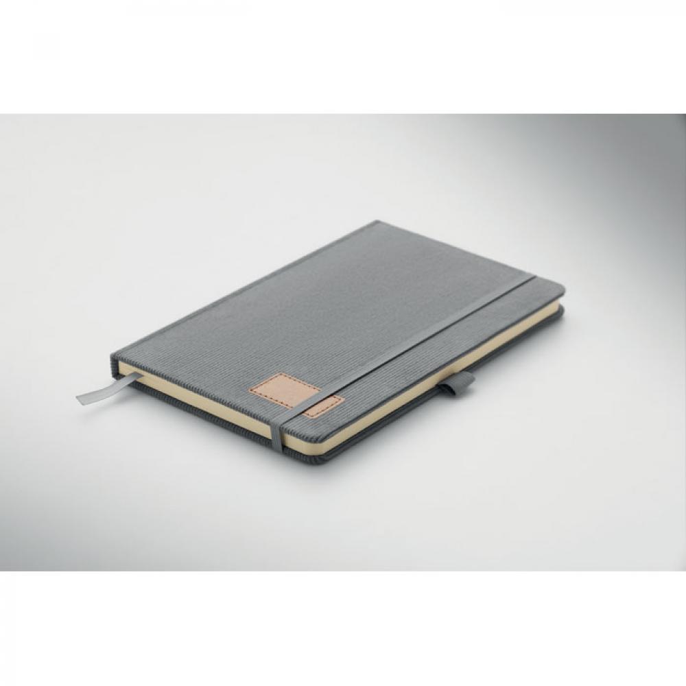 Блокнот формата A5 с твердой обложкой из вельвета из переработанного полиэстера (RPET) и 192 линованными страницами из переработанной бумаги (плотностью 70 г/м2). Переплетный дизайн с эластичной лентой для закрытия, петлей для ручки, закладкой-ленточкой и биркой из промытой крафт-бумаги.
