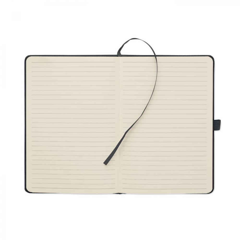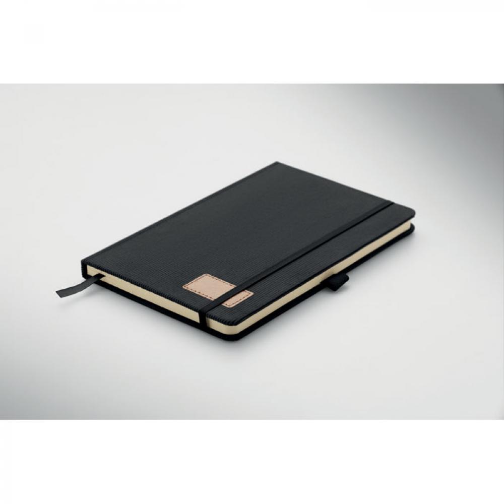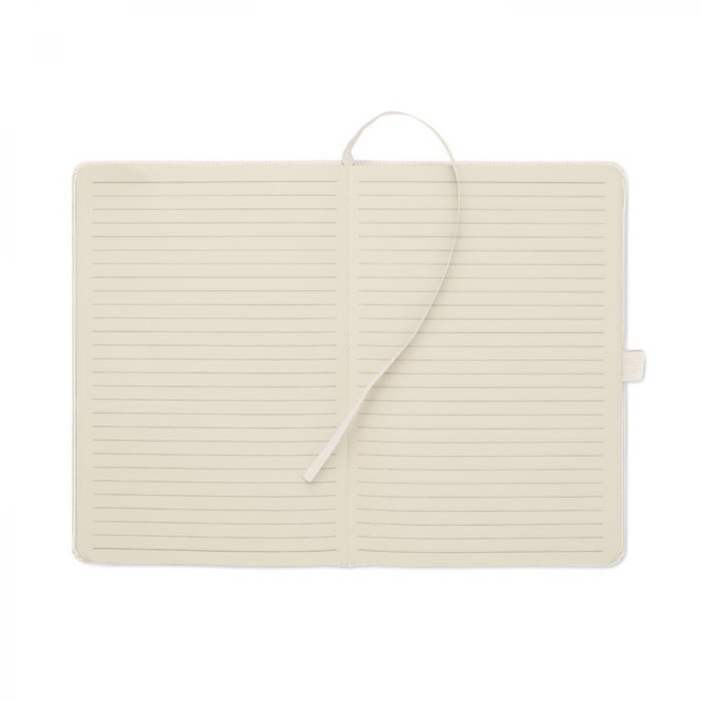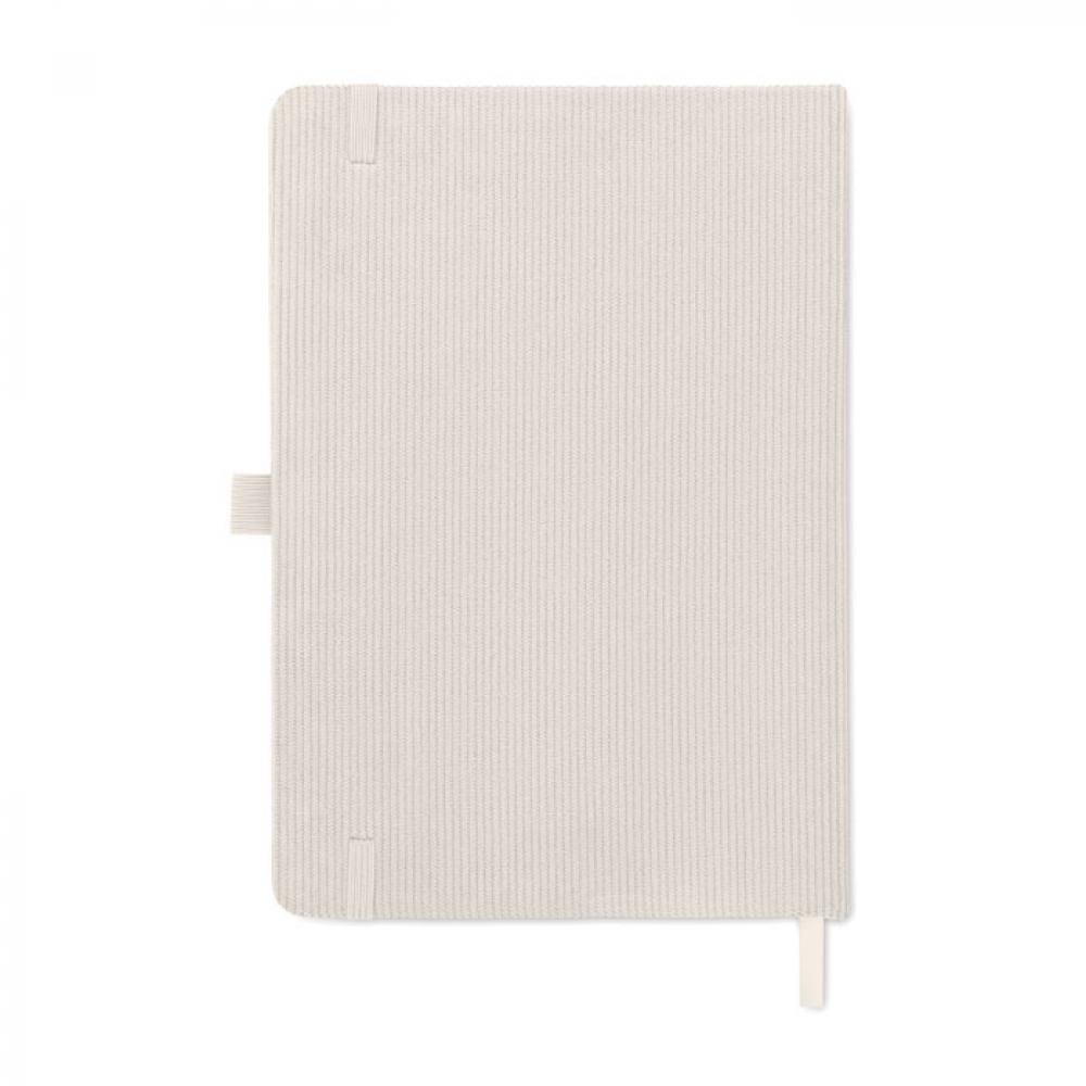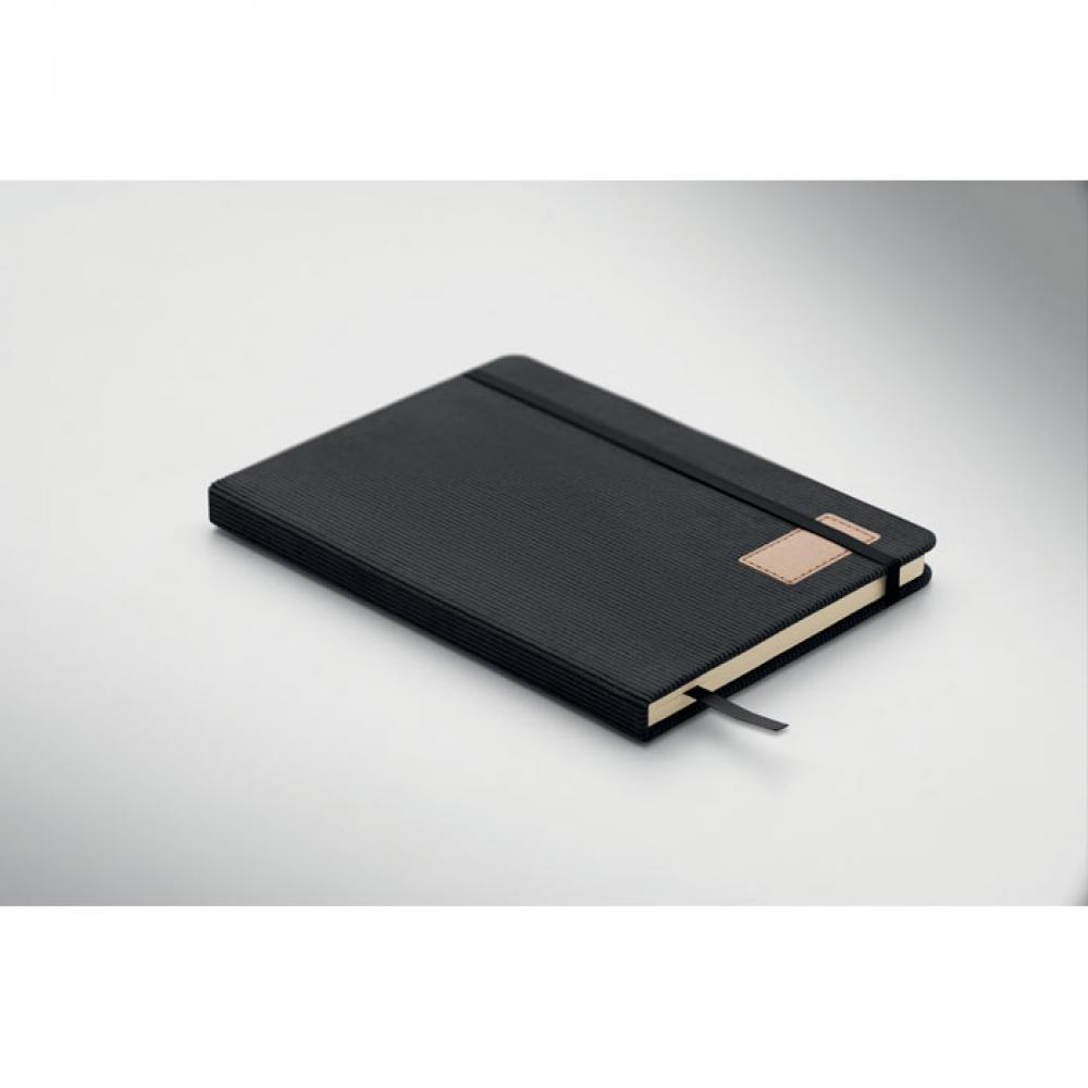 Блокнот формата A5 с твердой обложкой из вельвета из переработанного полиэстера (RPET) и 192 линованными страницами из переработанной бумаги (плотностью 70 г/м2). Переплетный дизайн с эластичной лентой для закрытия, петлей для ручки, закладкой-ленточкой и биркой из промытой крафт-бумаги.