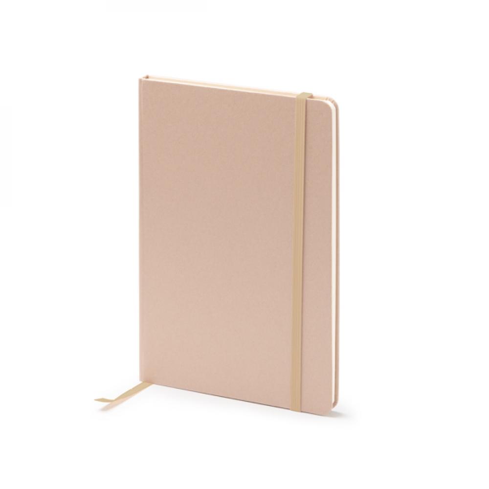 Блокнот формата A5 с твердыми обложками из фруктовых отходов. В комплекте идет закладка и резинка. 80 листов линейной бумаги.
