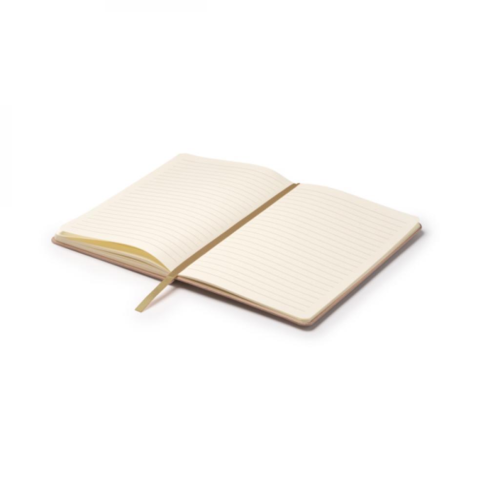 Блокнот формата А5 с твердыми обложками из фруктовых отходов. В комплекте идет закладка и резинка. 80 листов линейной бумаги.