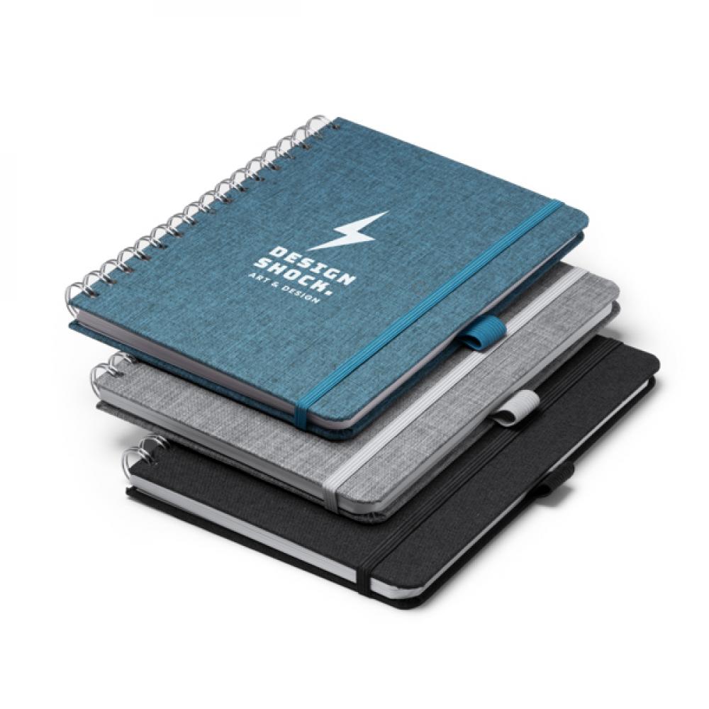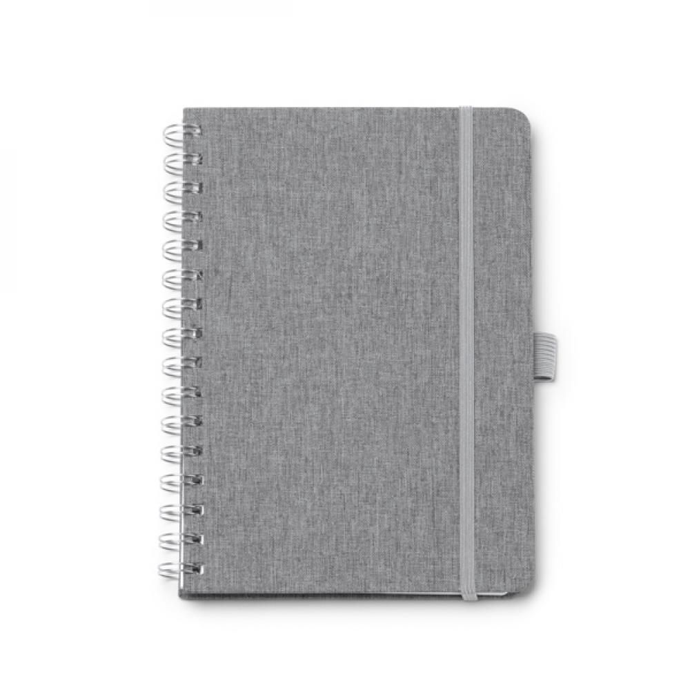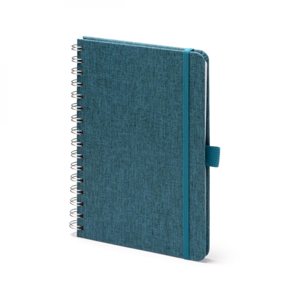 Блокнот формата A5 с твердой обложкой из переработанного полиэстера RPET с двойным спиральным кольцом. Эластичный ремешок для фиксации и держатель для ручки, соответствующие обложке. 80 листов линейной бумаги.