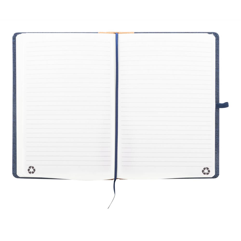 Блокнот с обложкой из переработанного полиэстера с натуральным пробковым позвоночником и 80 линованными листами из переработанной бумаги. С закладкой, резиновым ремешком и держателем для ручки. Размер A5.