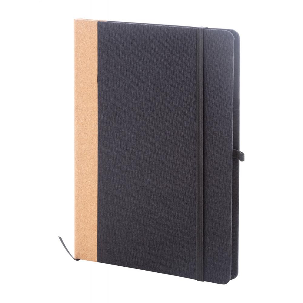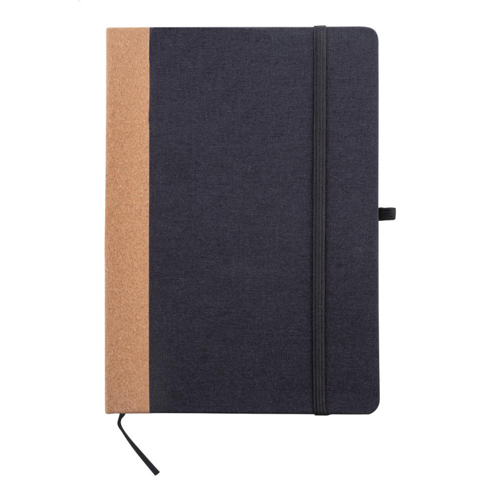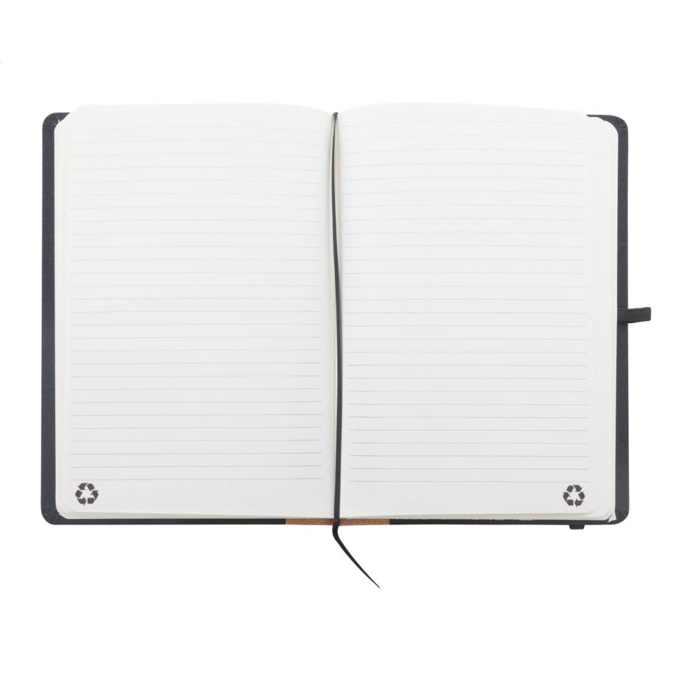 Блокнот с обложкой из переработанного полиэстера с натуральным пробковым позвоночником и 80 линованными листами из переработанной бумаги. С закладкой, резиновым ремешком и держателем для ручки. Размер A5.