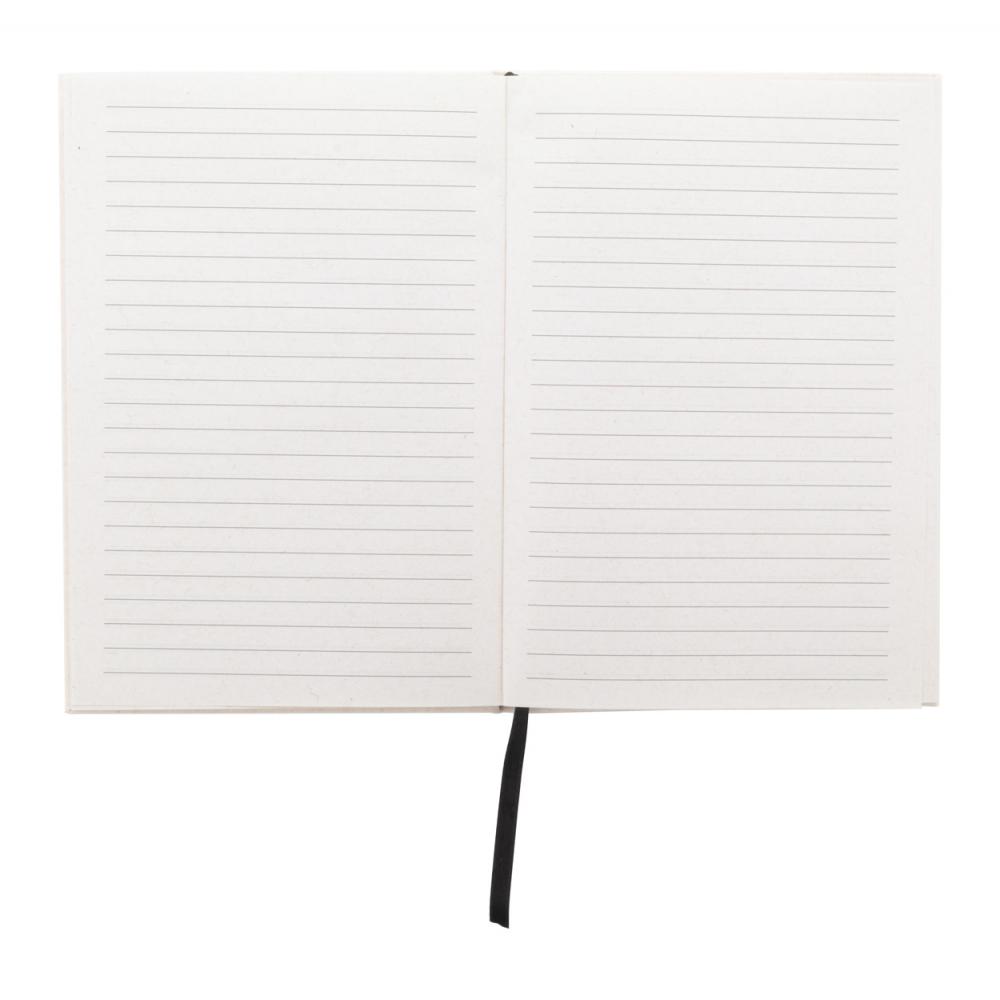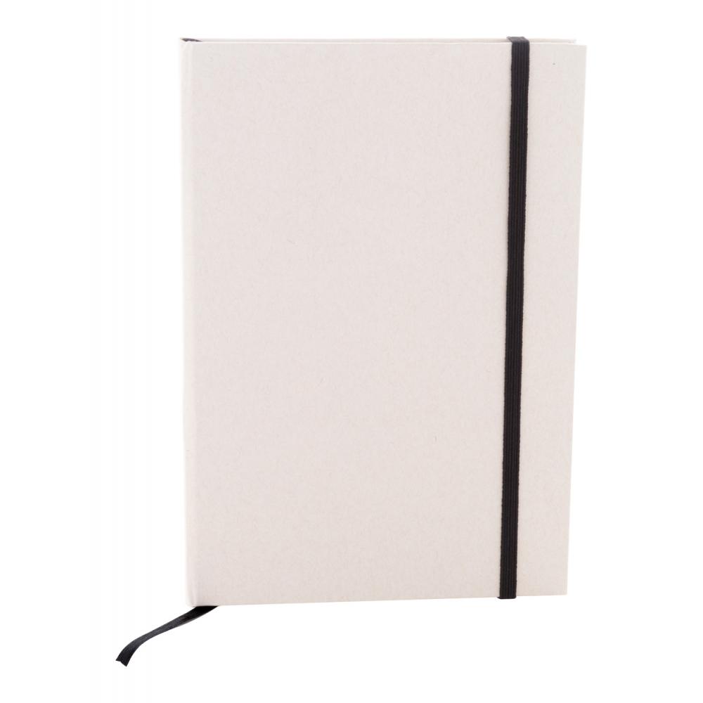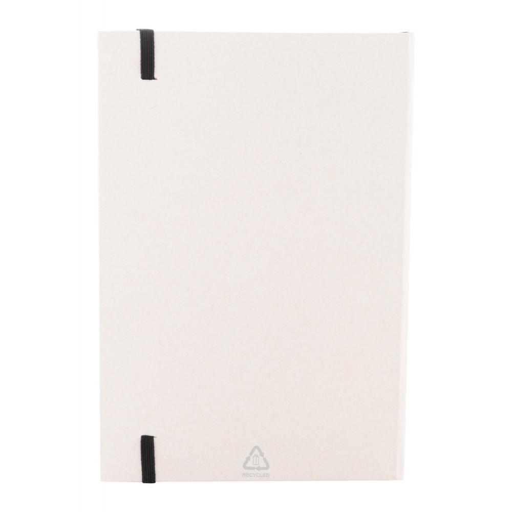 Блокнот из переработанной бумаги из молочных пакетов с твердой обложкой и 80 линованными листами. С резинкой и держателем для ручки в подходящем цвете. Размер A5.