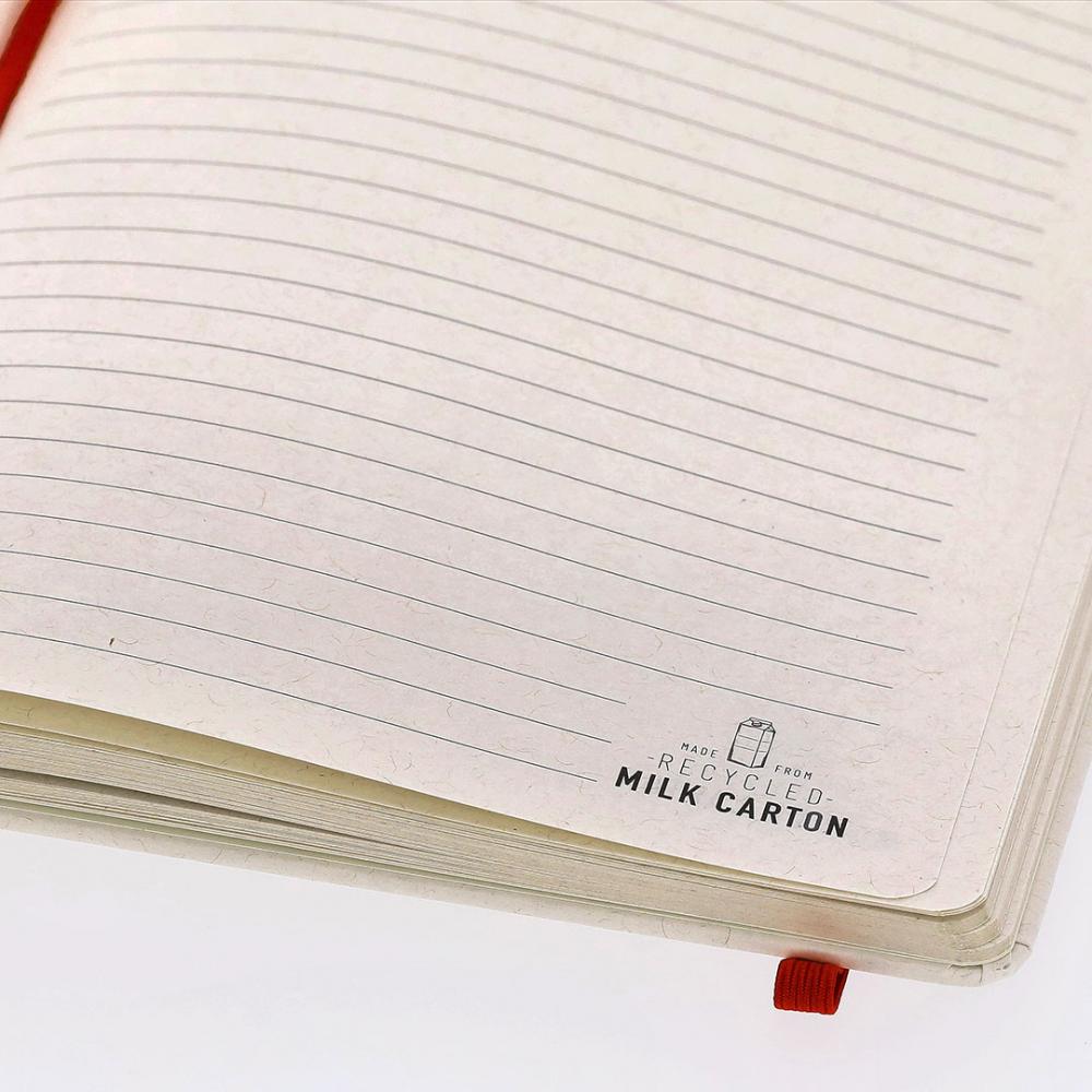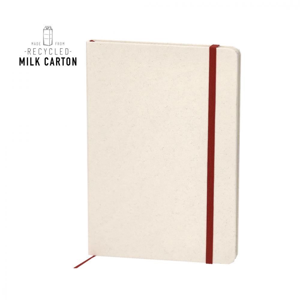 Блокнот с жесткими обложками из переработанных молочных картонов. Включает 80 листов натурального цвета с линовкой, с эластичной лентой и цветным ляссе. На задней обложке и внутренних листах указано "Переработанный молочный картон". Молочные картоны в основном изготовлены из картона и алюминия. В процессе их переработки различные материалы из контейнера отделяются для повторного использования, что способствует бесконечному циклу круговой экономики. Этот материал характеризуется высокой перерабатываемостью, а также легкостью и прочностью.
