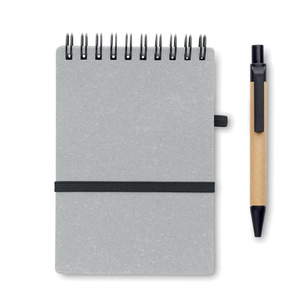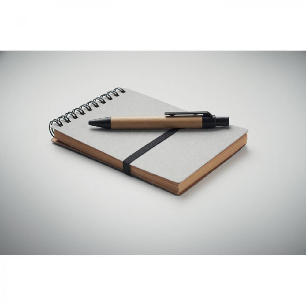 Блокнот в обложке из 70% переработанной бумаги и 30% полиуретана. Двойная проволока. 140 линованных страниц из переработанной бумаги (70 листов). Кнопочная шариковая ручка из переработанной бумаги и пластика. Синие чернила. Эластичный ремешок и держатель для ручки. FSC®-certified | FSC MIX CREDIT, P7.1, FSC-C213206