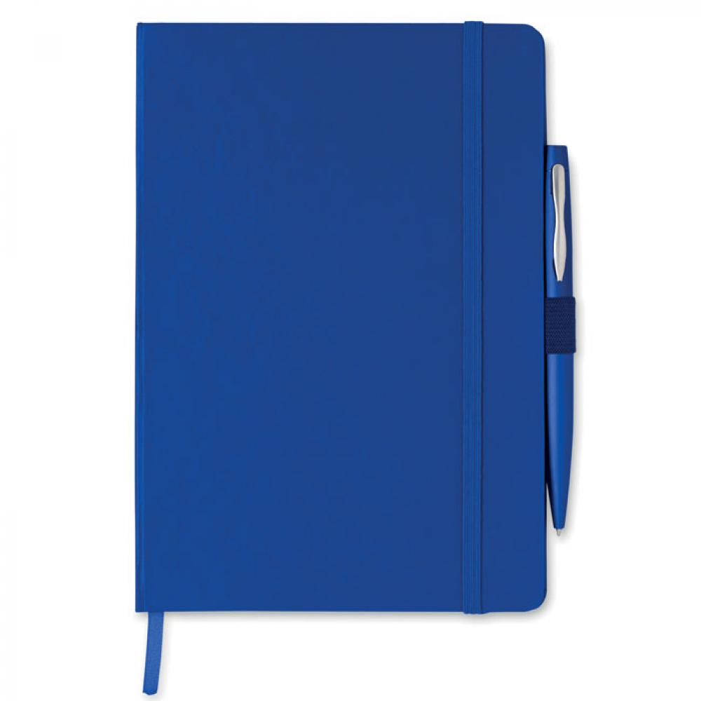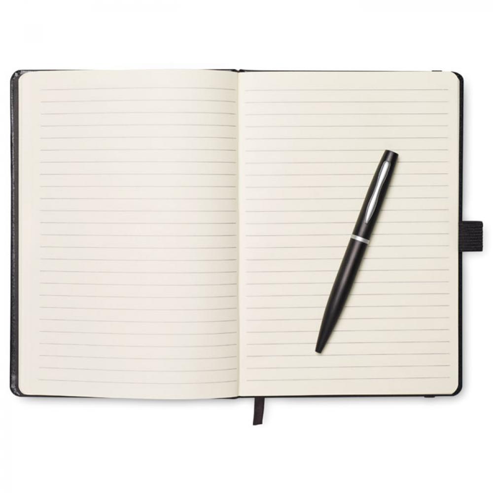 Блокнот A5 с обложкой из картона, 72 линованных листа, с лентой- закладкой, перетянут резинкой. Включает металлическую шариковую ручку с синими чернилами. FSC MIX CREDIT | P7.1 | FSC-C213206