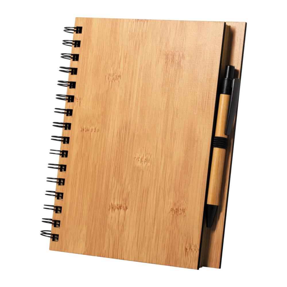 Спиральный блокнот в бамбуковом переплете. В комплекте бамбуковая шариковая ручка с черным стержнем. 80 линованных листов формата А5.