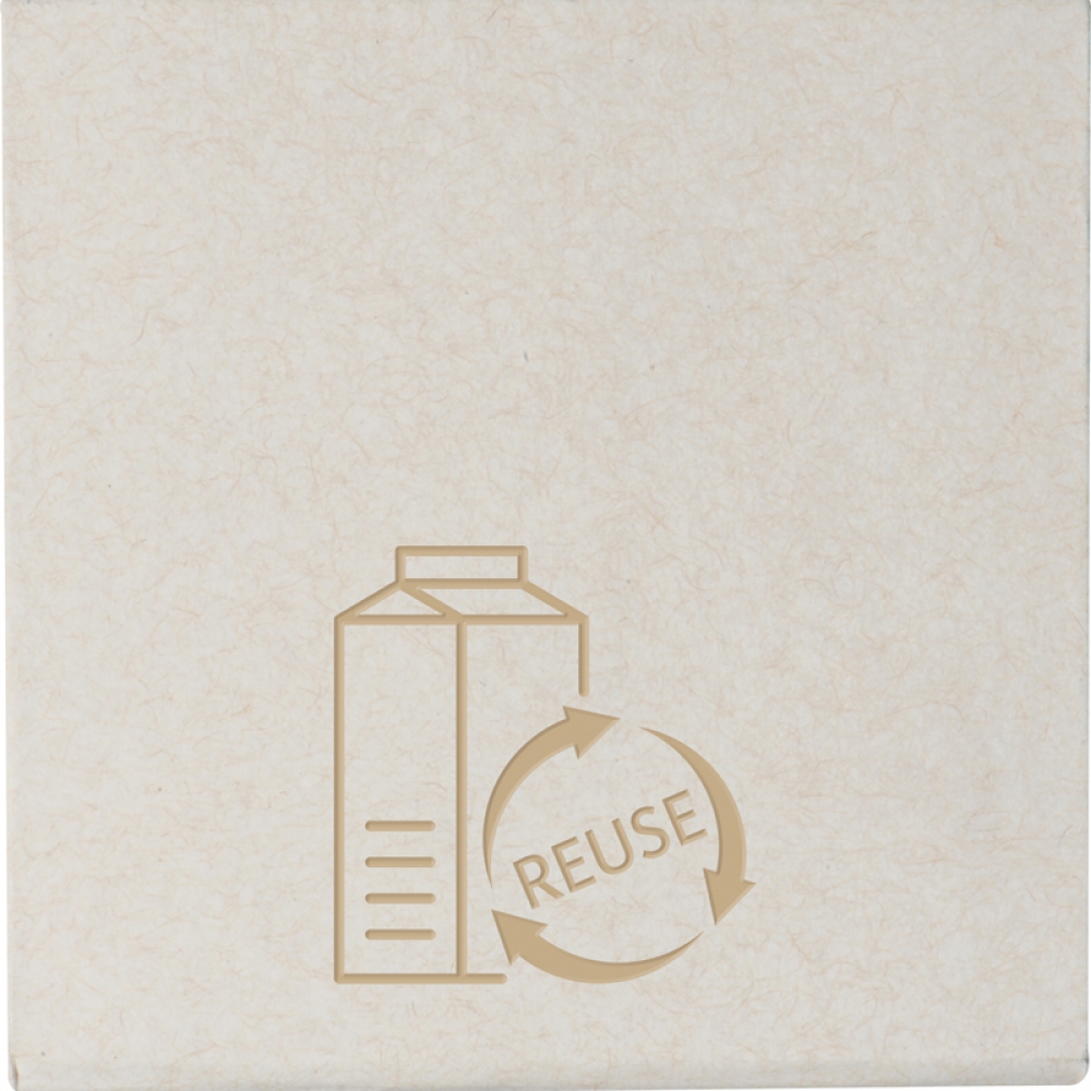 Блокнот с 200 листами для заметок, изготовленными из переработанной бумаги молочных картонных упаковок.