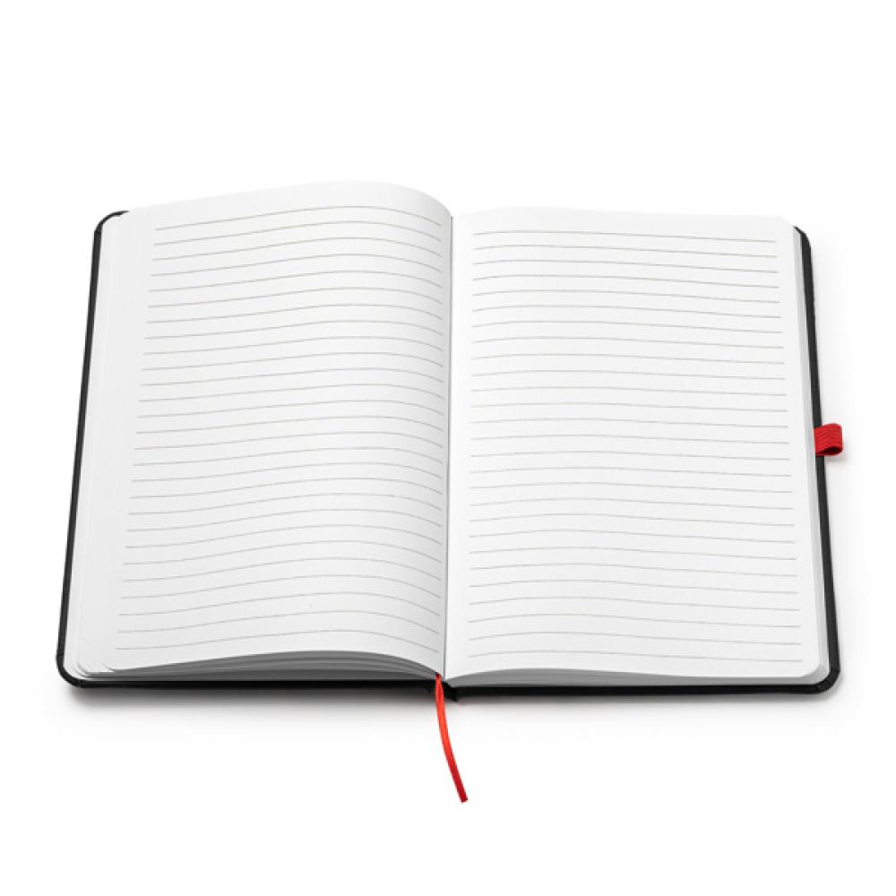 Тетрадь формата A5 с жесткими обложками из черного PU. Цветная закладка, резинка и держатель для ручки. 80 линейных листов.