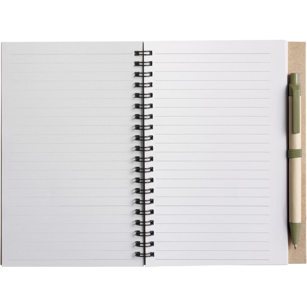 Эко-блокнот (примерно A5, около 60 линованных листов), прикрепленная шариковая ручка с биоразлагаемыми частями, спиральный переплет