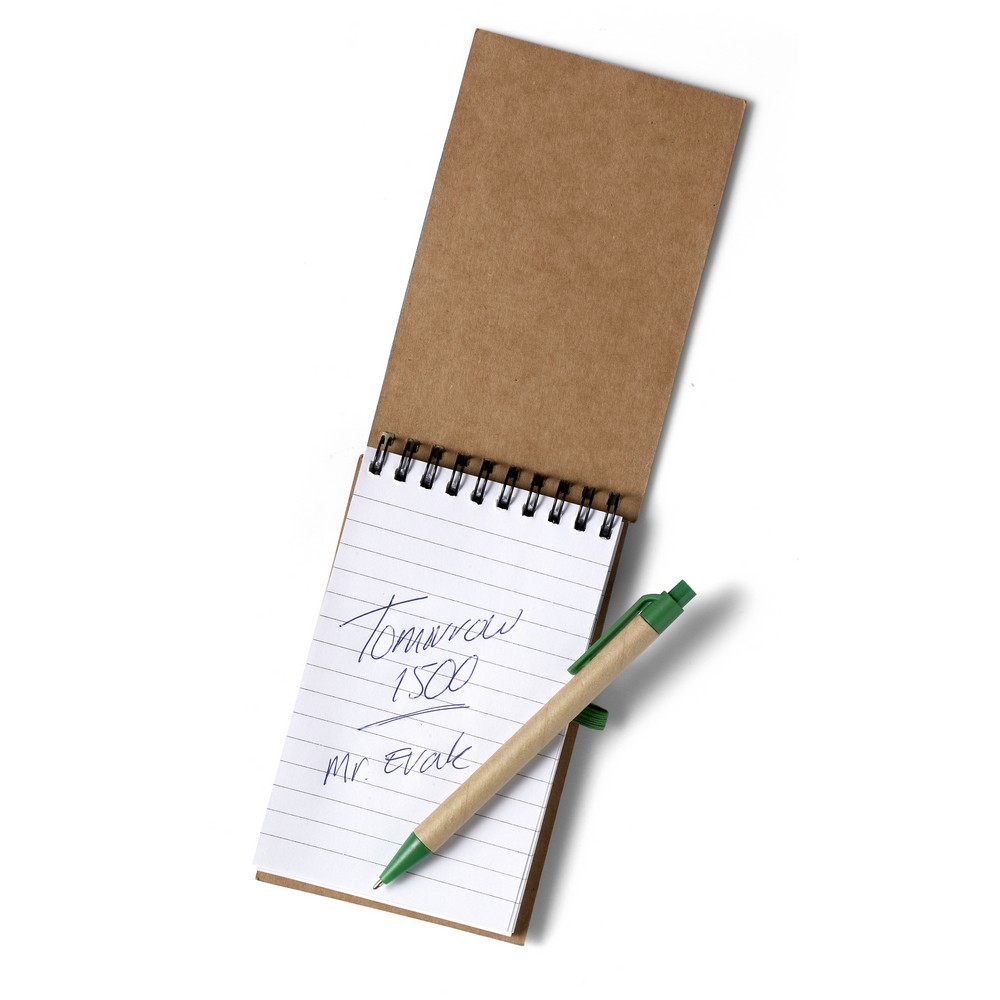 Блокнот (примерно А6, 70 листов в линовку) с шариковой ручкой, резинка для закрытия, спиральный переплет
