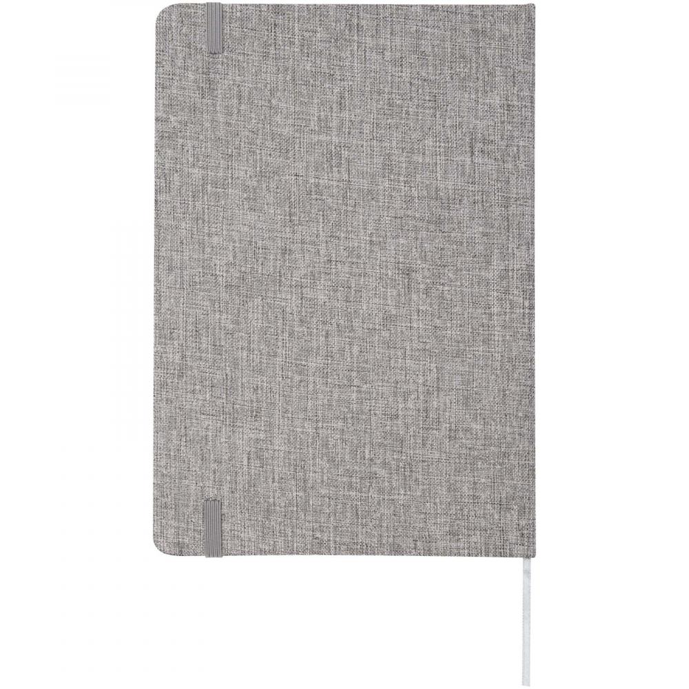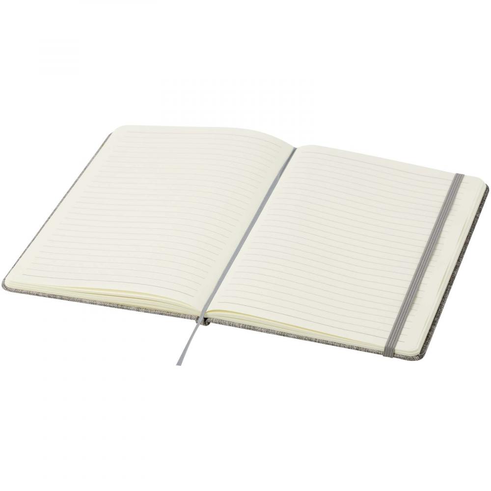 Тетрадь в твердой обложке формата A5, изготовленная из переработанного хлопка, содержит 80 линованных листов бумаги плотностью 70 г/м². Тетрадь оснащена эластичной застежкой, лентой-закладкой и закругленными углами.