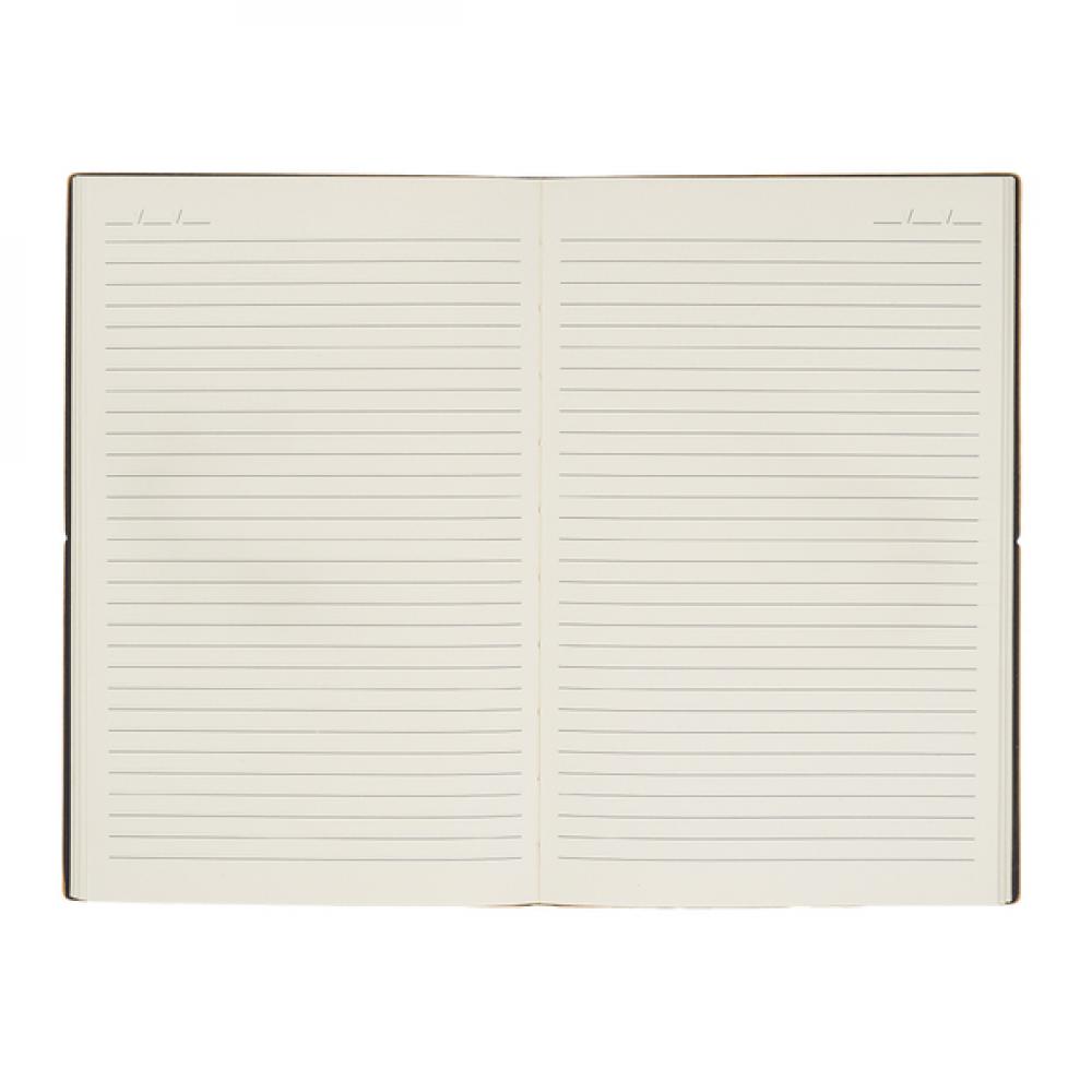 Блокнот с переработанным кожаным переплетом (75%), закрывается на резинку. В блокноте есть ляссе для отметки страниц. 80 кремовых линейных страниц, плотность бумаги 80 г/м2.