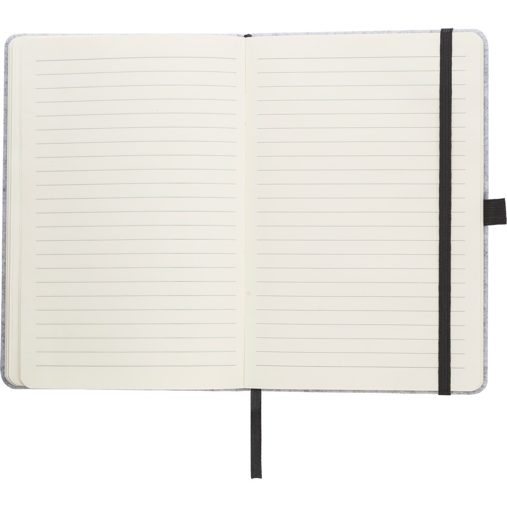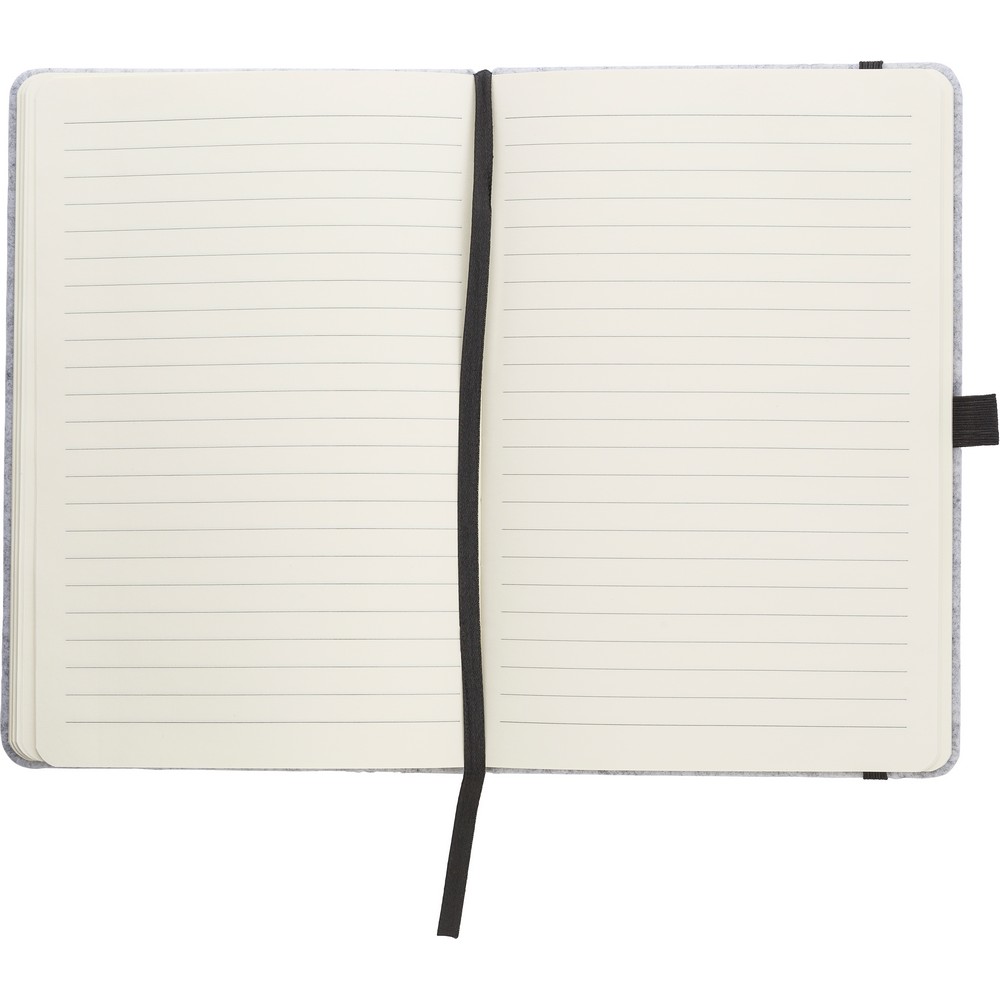 Блокнот формата A5 (160 линейных листов), обложка из фетра RPET, петля для ручки, ляссе-закладка, резинка для закрытия.