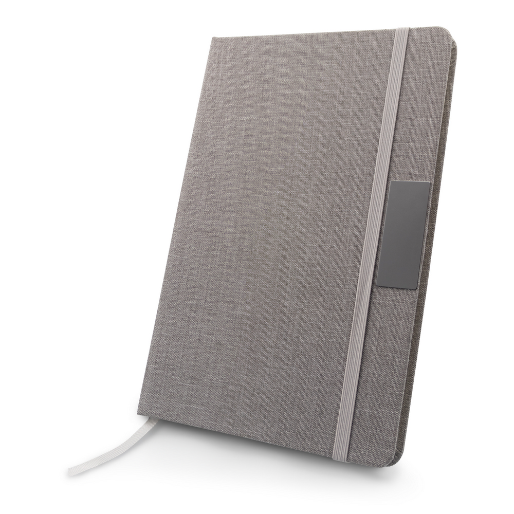 Блокнот формата А5 с 80 линованными листами (160 страниц), дополнительной резинкой для закрытия в подходящем цвете, с металлическим элементом для гравировки логотипа или слогана, жесткая обложка из RPET.