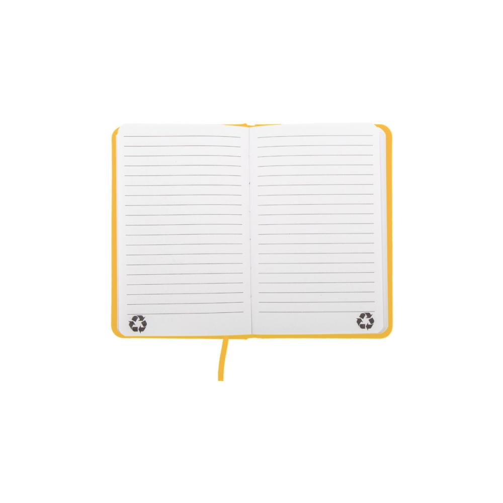 Блокнот с обложкой из переработанной кожи PU с 100 линованными листами из переработанной бумаги. Соответствующая цвету закладка и резинка. Размер A6.