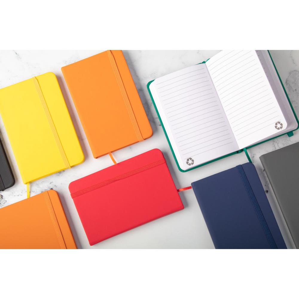 Блокнот с обложкой из переработанной кожи PU с 100 линованными листами из переработанной бумаги. Соответствующая цвету закладка и резинка. Размер A6.