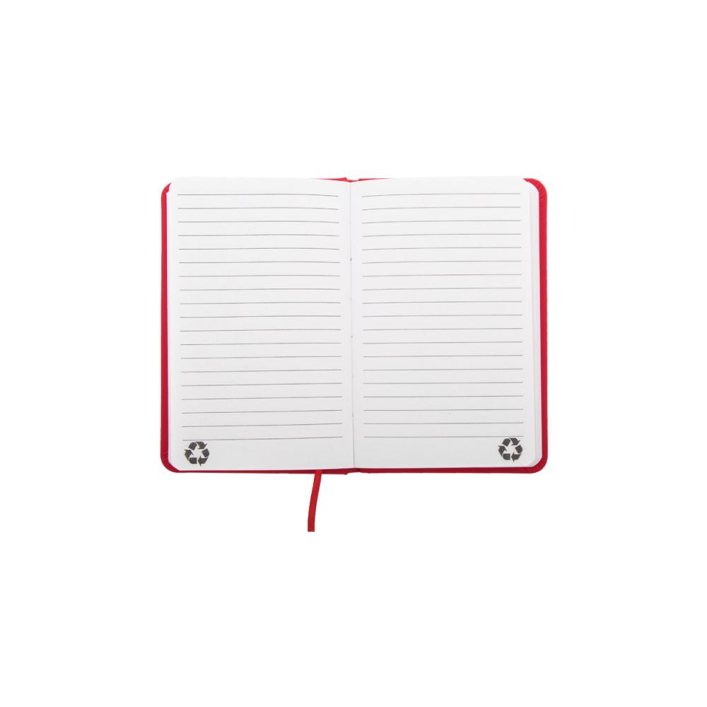 Блокнот с обложкой из переработанной кожи PU с 100 линованными листами из переработанной бумаги. Соответствующая цвету закладка и резинка. Размер A6.