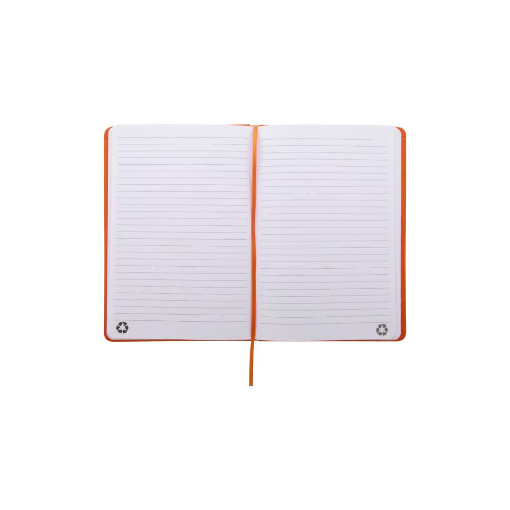 Блокнот с обложкой из переработанной кожи PU с 100 линованными листами из переработанной бумаги. Соответствующая цвету закладка и резинка. Размер A5.