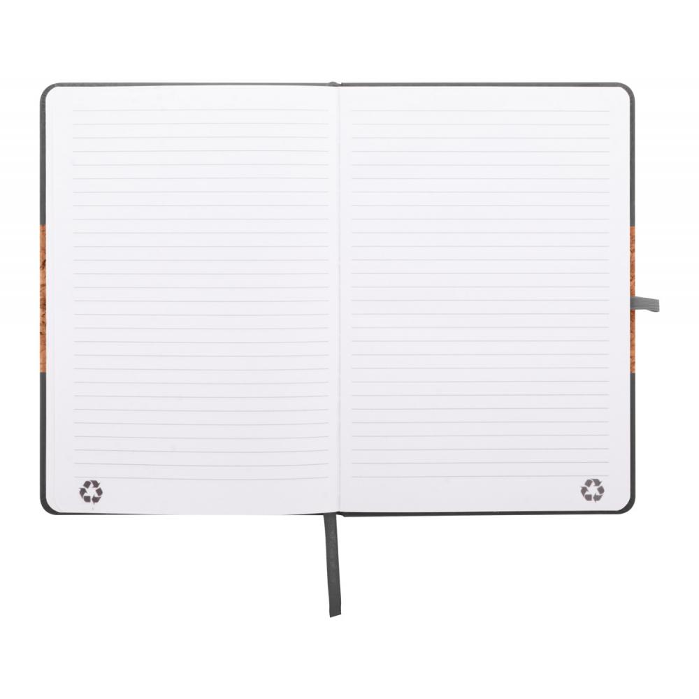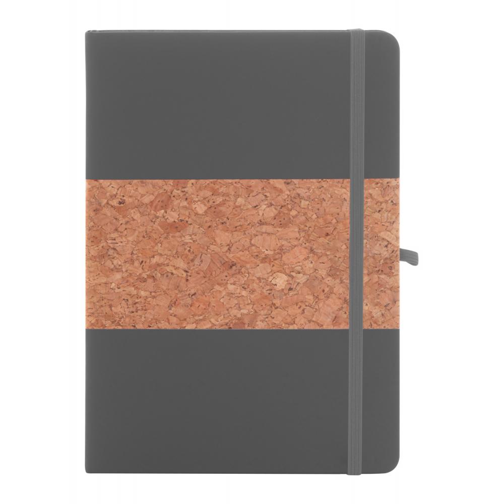 Блокнот с обложкой из натурального пробкового материала и переработанной кожи PU с закладкой, резинкой и держателем для ручки в тон. Внутри 80 линованных листов из переработанной бумаги. Размер A5.